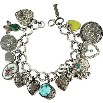 Amazing Vintage Charm Bracelet with Puffy Hearts, Native Charms and Religious Charms