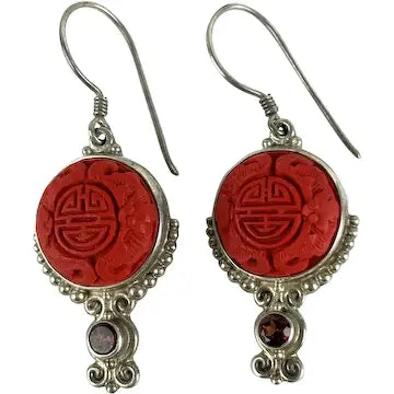 Vintage Sterling Silver Sajen Drop Earrings with Cinnabar and Garnets