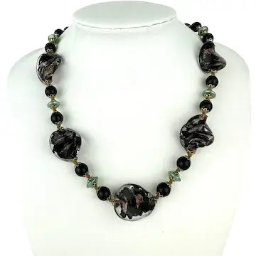 Vintage Venetian Glass Bead Necklace with Aventurine Twisted Flat Beads