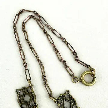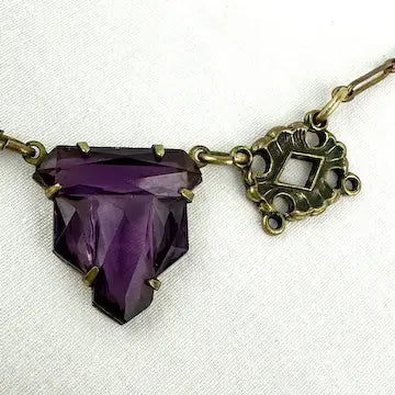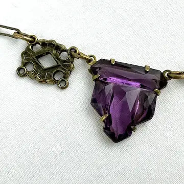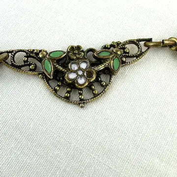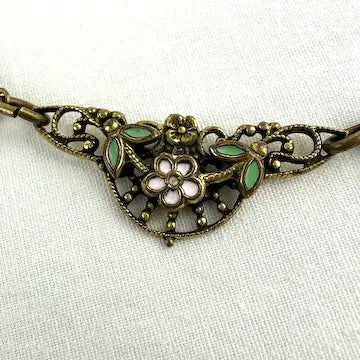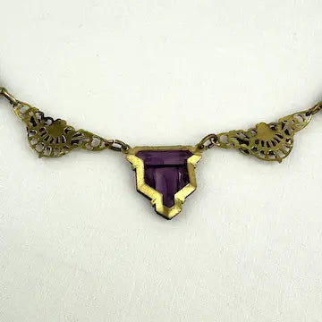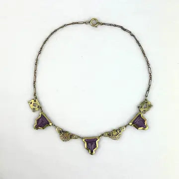 Experience timeless elegance with our art deco czech glass rhinestone choker necklace. Crafted with antique gold tone paper clip style chain, this necklace features enchanting czech amethyst colored glass rhinestones cut in a unique kite shape. Surrounding the rhinestones are delicate enamel flowers, adding a touch of charm to this Art Deco choker.