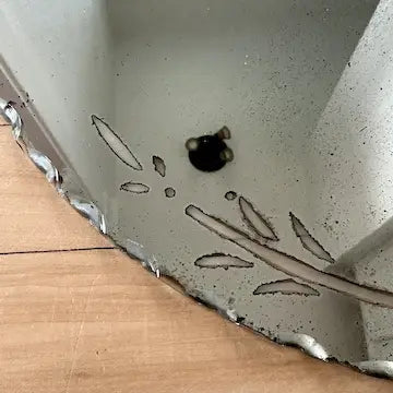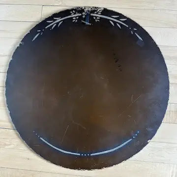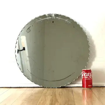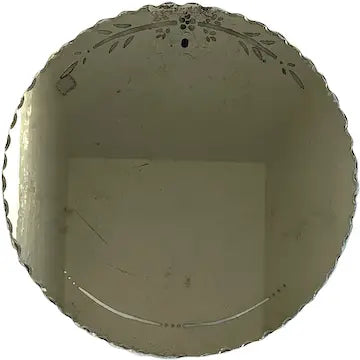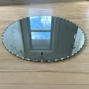 This art deco etched glass wall mirror boasts vintage charm with its intricate leaf detailing along the edges. The beveled and scalloped edges add a touch of elegance, making it the perfect addition to any wall. Made of high-quality glass, it is a durable and timeless piece that adds both style and function to your space.