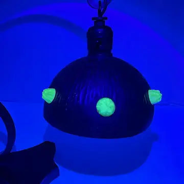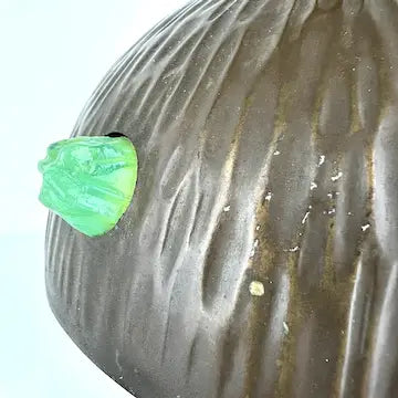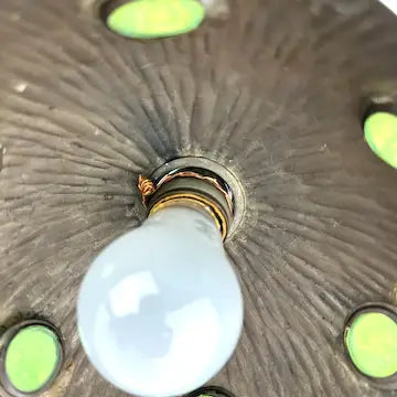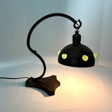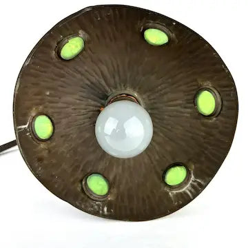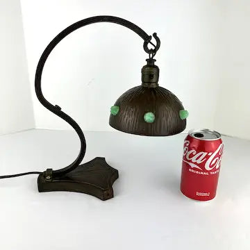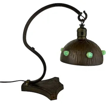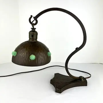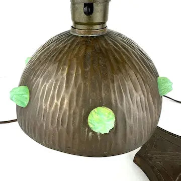 Elevate your home with this antique Art Deco glass jewel lamp. The brass with bronze tone finish adds sophistication while the hanging bell shade offers a warm and inviting ambiance. The shade is adorned with Uranium glass chunk jewels, creating a unique and elegant touch. Rest assured with high-quality Leviton electrical components.