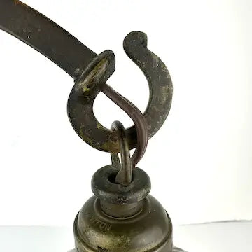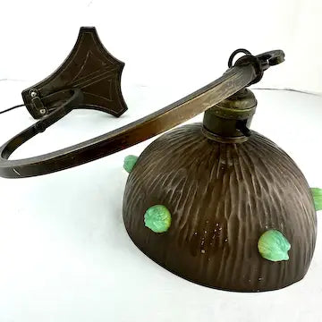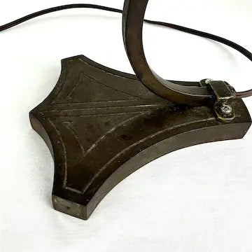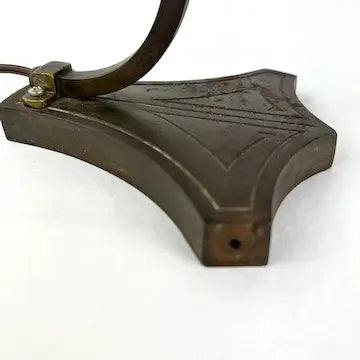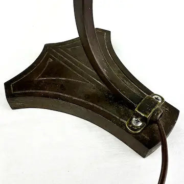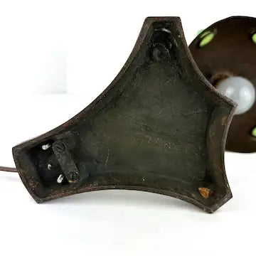 This lamp has been modified in the past. The previous owner was using it as a bedroom accent lamp but it may have been a wall hanging lamp with what is now the base facing in the other direction. Two newer screws have been added to attach the arm to the base. Also from the side you can see that there is a small hole on each side of the base that something was once attached to. A creative person could probably figure out how to use it as a wall mount if desired.