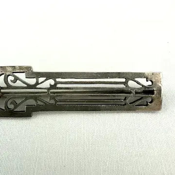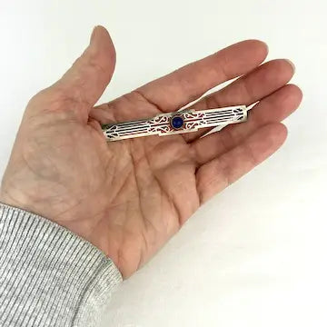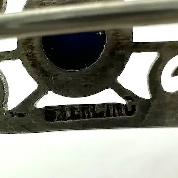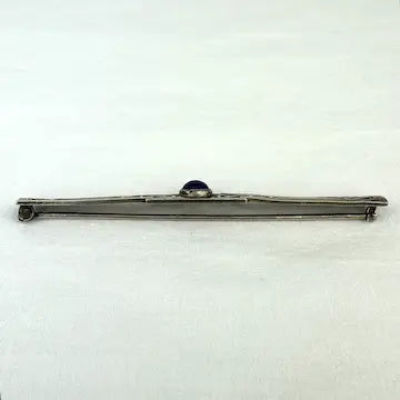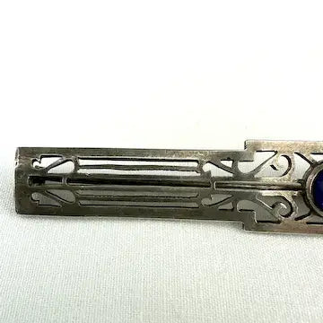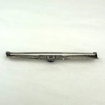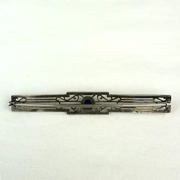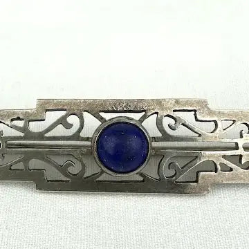 Experience the sleek and sophisticated style of the Art Deco era with our Art Deco bar brooch. Made of high-quality sterling silver, this stunning brooch features a center Lapis stone cabochon bezel set, surrounded by intricate silver open work. Perfect for adding a touch of elegance to any outfit, with a round hinge and c-clasp pin for secure wear.
