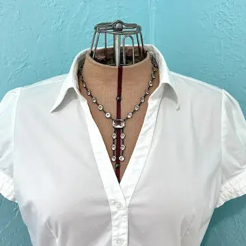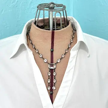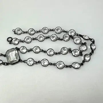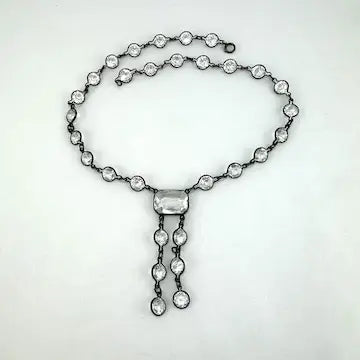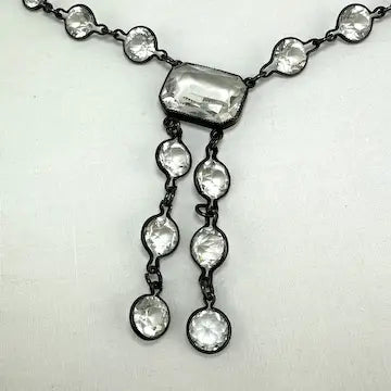 Expertly crafted in the 1920s, this Art Deco sterling silver necklace showcases a luxurious lariat design. Its central rectangular faceted stone is elegantly surrounded by sparkling clear glass stones, creating a riviere effect. Add a touch of vintage glamour to any outfit.