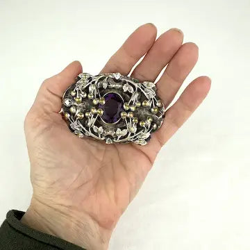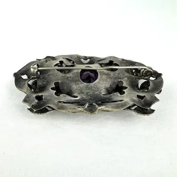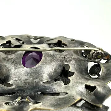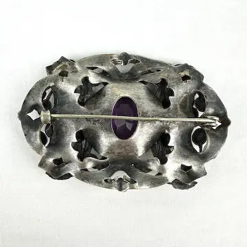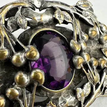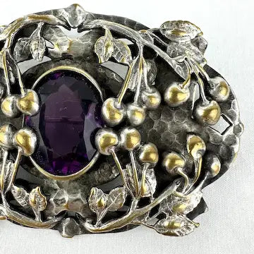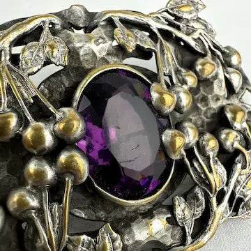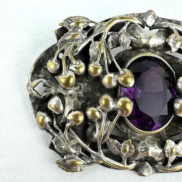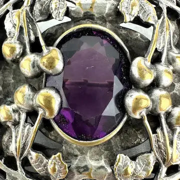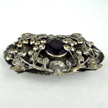 This vintage Arts and Crafts brooch features a dazzling faceted amethyst glass stone, bezel set in a silver tone berry and leaf design. With its round hinge and c clasp, it is easy to wear and adds a touch of elegance to any outfit. A must-have for antique collectors and jewelry lovers alike.