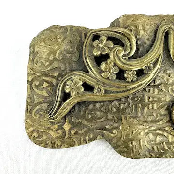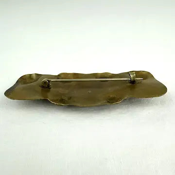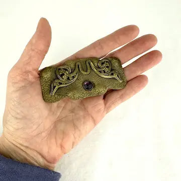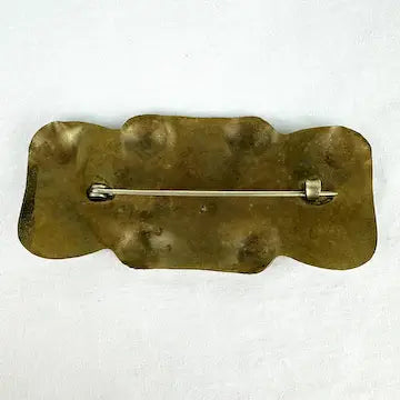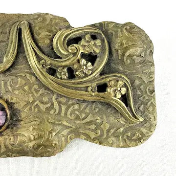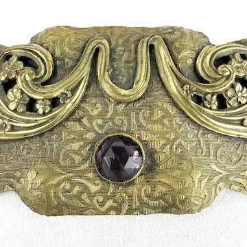 Expertly crafted in the vintage arts and crafts style, this brooch features a stunning rectangular amethyst glass bead surrounded by a floral and leaf pattern in brass. Add a touch of 1920s charm to any outfit with this elegant and unique piece.