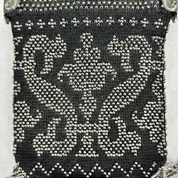 This is a stunning art deco beaded handbag. the Fleur de Los pattern is created in silver beads on a black background and fringed on the bottom. It is held together with a metal frame decorated with a leaf pattern and chain handle. This would be a great accessory for a special occasion.