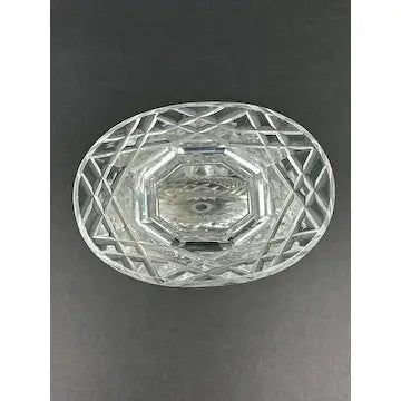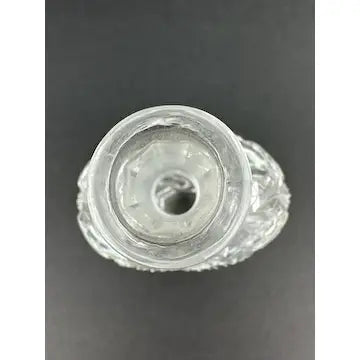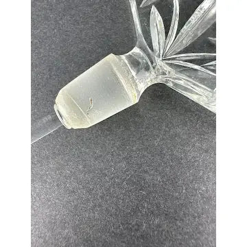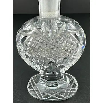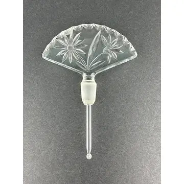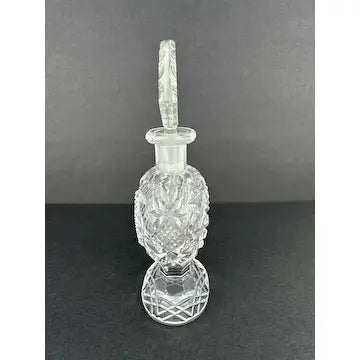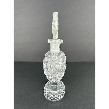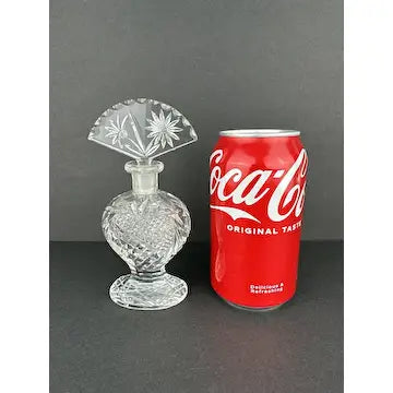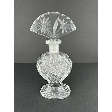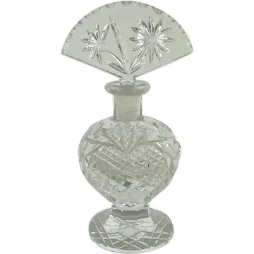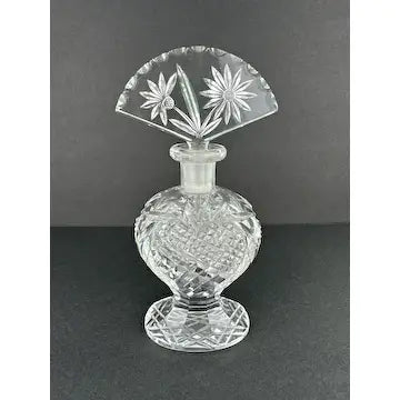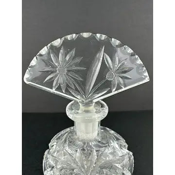 This vintage Bohemian perfume bottle features a stunning cut glass design in clear glass, with a beautiful fan-shaped stopper and intricate floral details. Made in Czech, this piece exudes an elegant Art Deco style. Perfect for adding a touch of luxury to your vanity or as a collectible item.