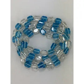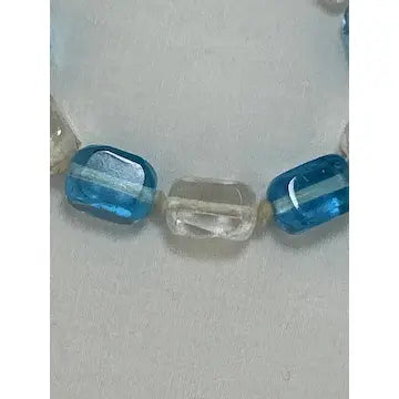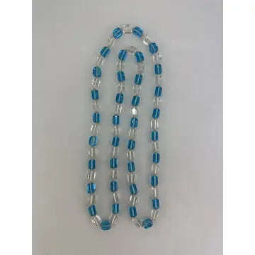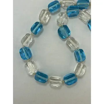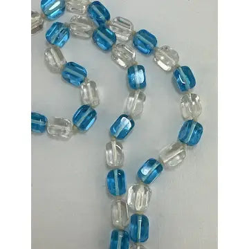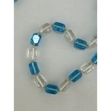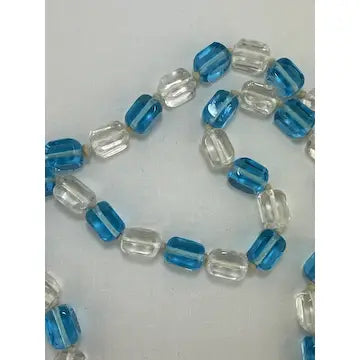 Expertly crafted with vintage hand-knotted Czech glass, this stunning necklace features stylish cubed beads in clear and blue. With an art deco design and opera length, this statement piece is sure to elevate any outfit. Add a touch of elegance and history to your collection with this one-of-a-kind necklace.