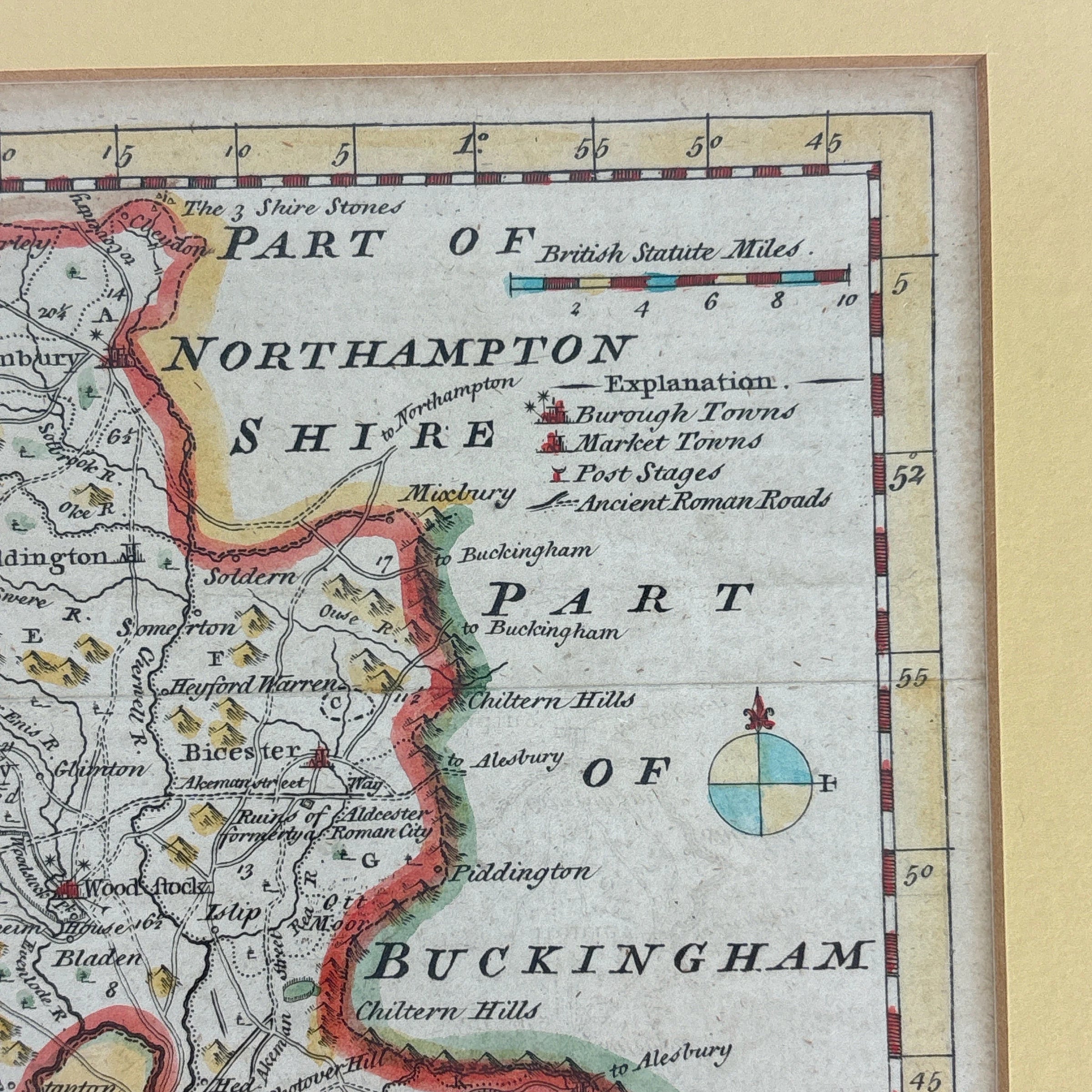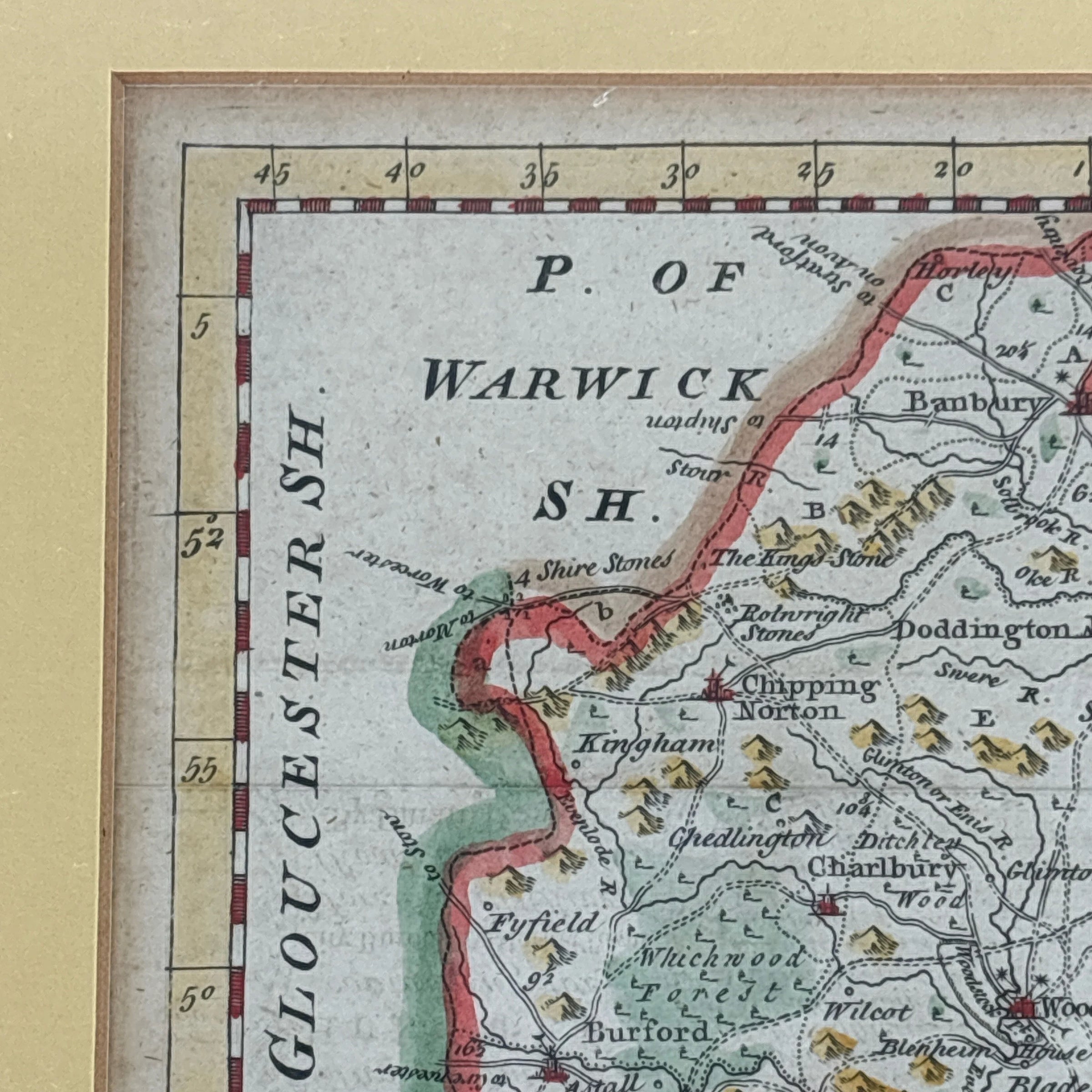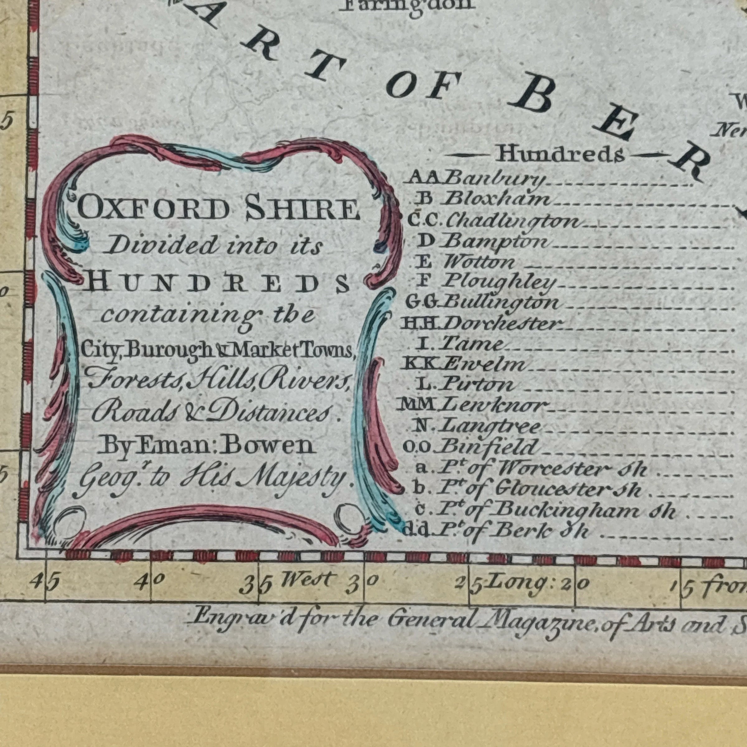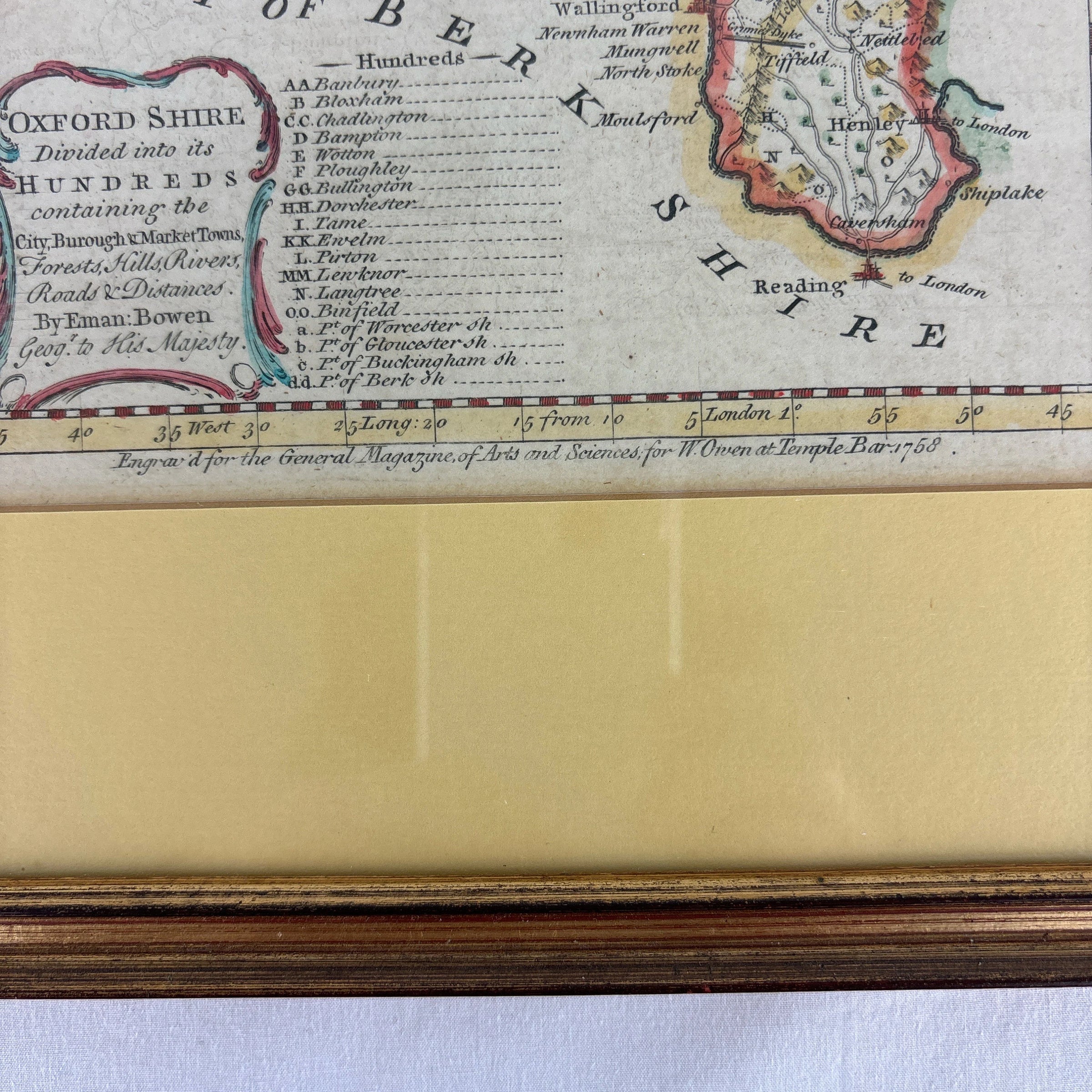 This is an antique hand colored map of Oxford Shire England. It was made by Eman Bowen in 1758. The note at the bottom reads “Engraved for the General Magazine of Arts and Sciences for W Owen at Temple Bar 1758. It is professionally framed and still has beautiful color.