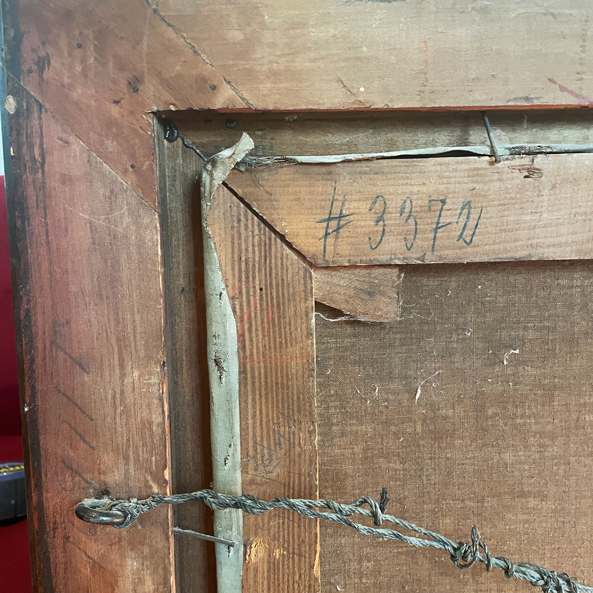 It is in good condition. There are small areas of paint loss right along the edge of the frame most likely from reframing. It is 41 1/2" x 35" x 3"