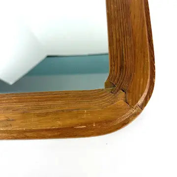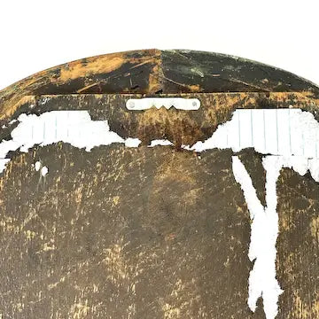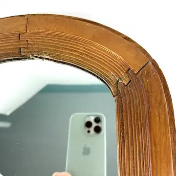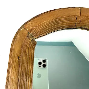 For some reason someone glued paper to the back of the frame. There is a spot on the back on the right that is missing part of the wood. It is soft and charred so possibly this mirror was exposed to fire??? The frame still feels sturdy and solid. The face of the frame is unaffected by this. The mirror is in great antique condition with minimal wear.