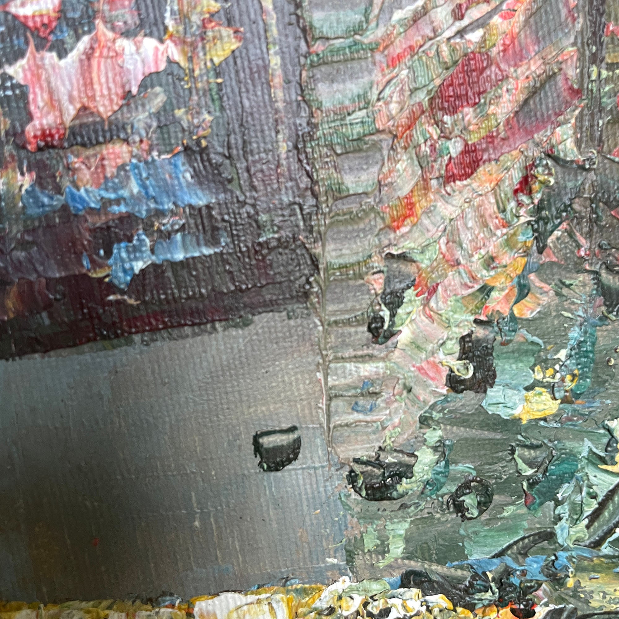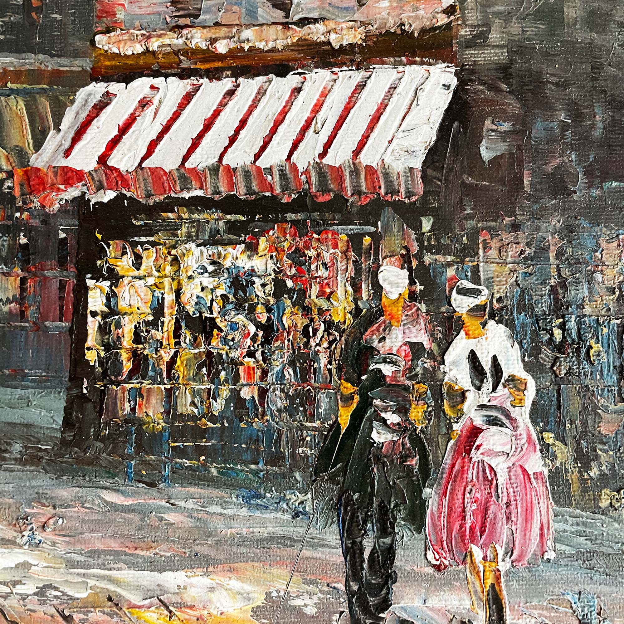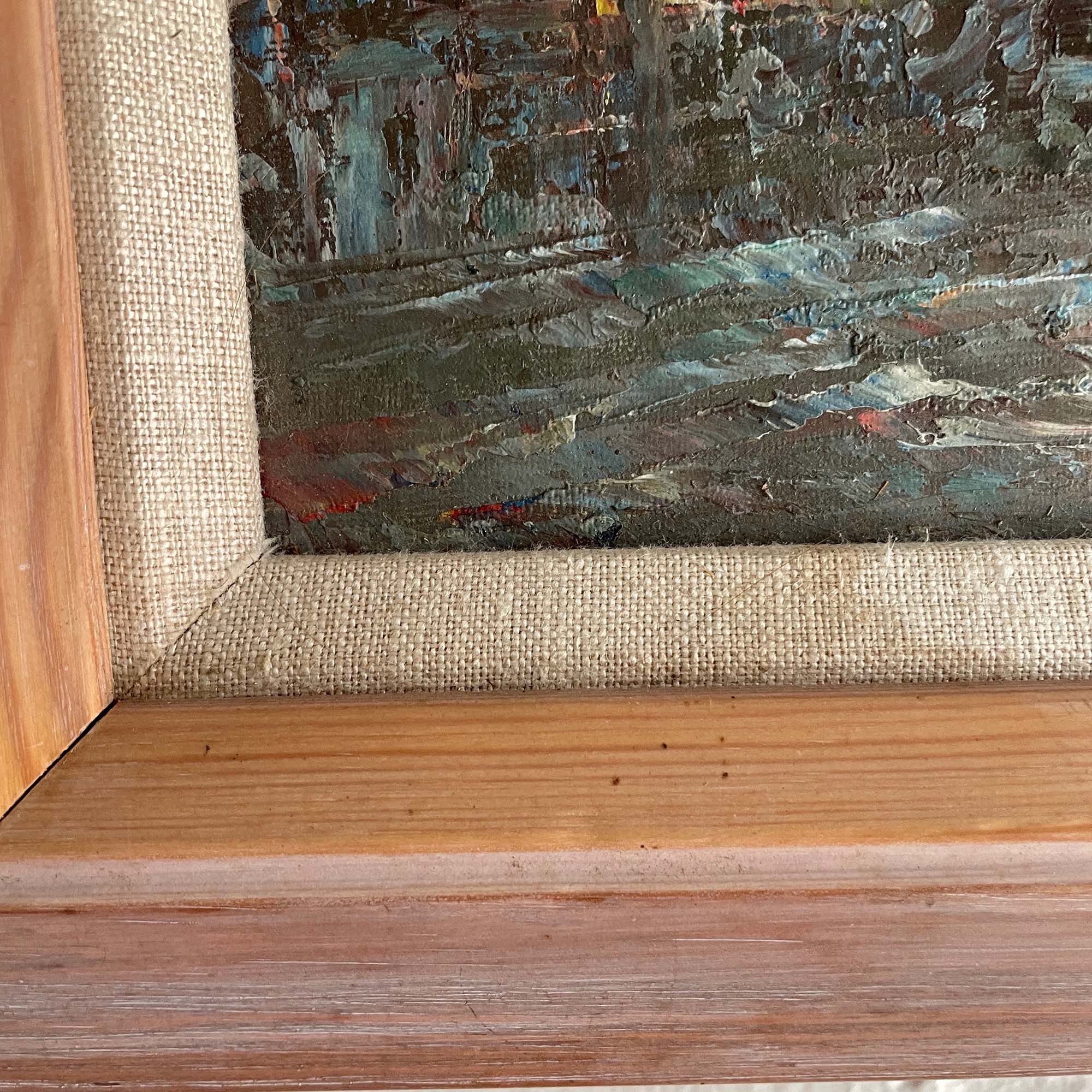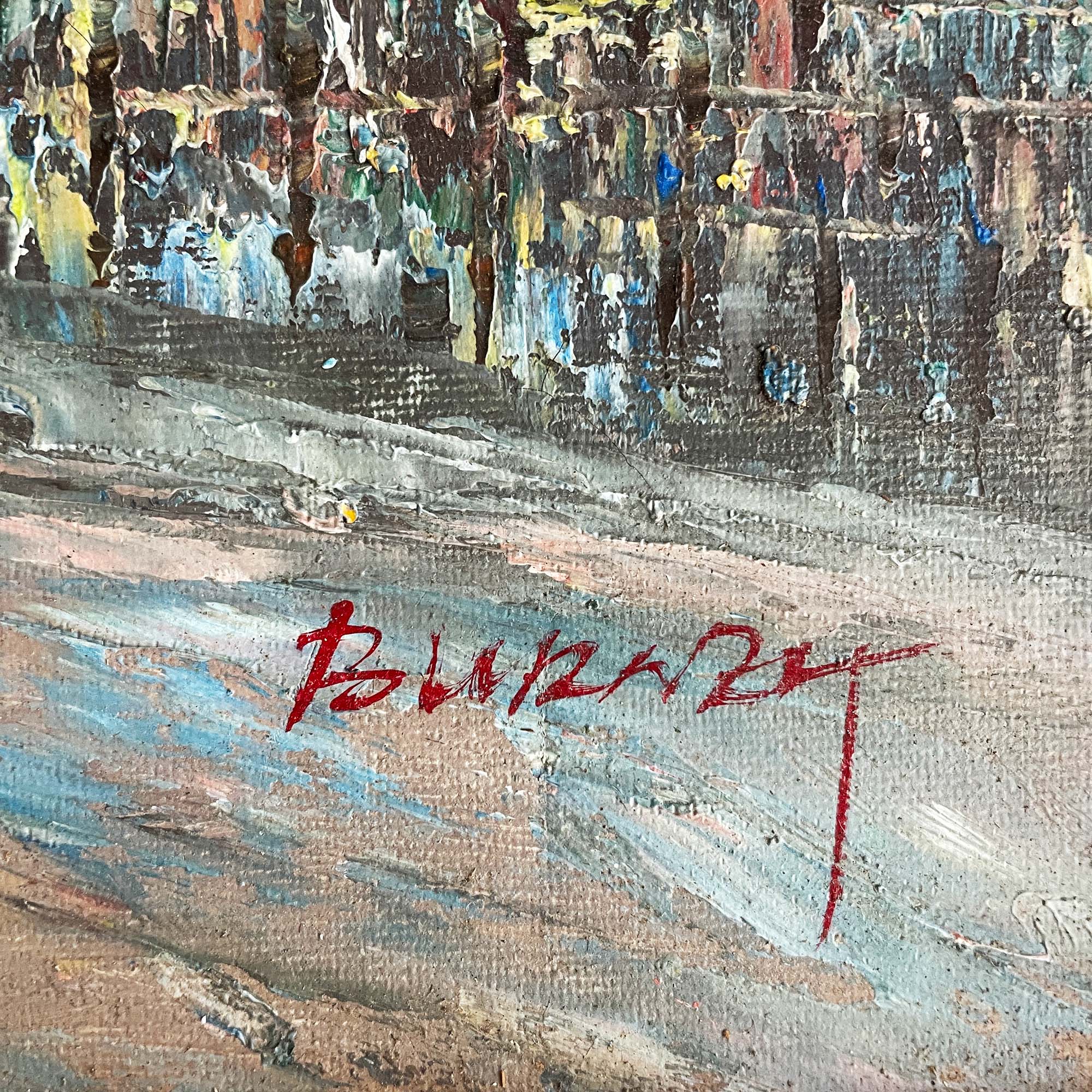 Vintage original oil painted artwork signed Burnz depicting a Paris street scene. This is a post impressionism style painting probably made Mid century.