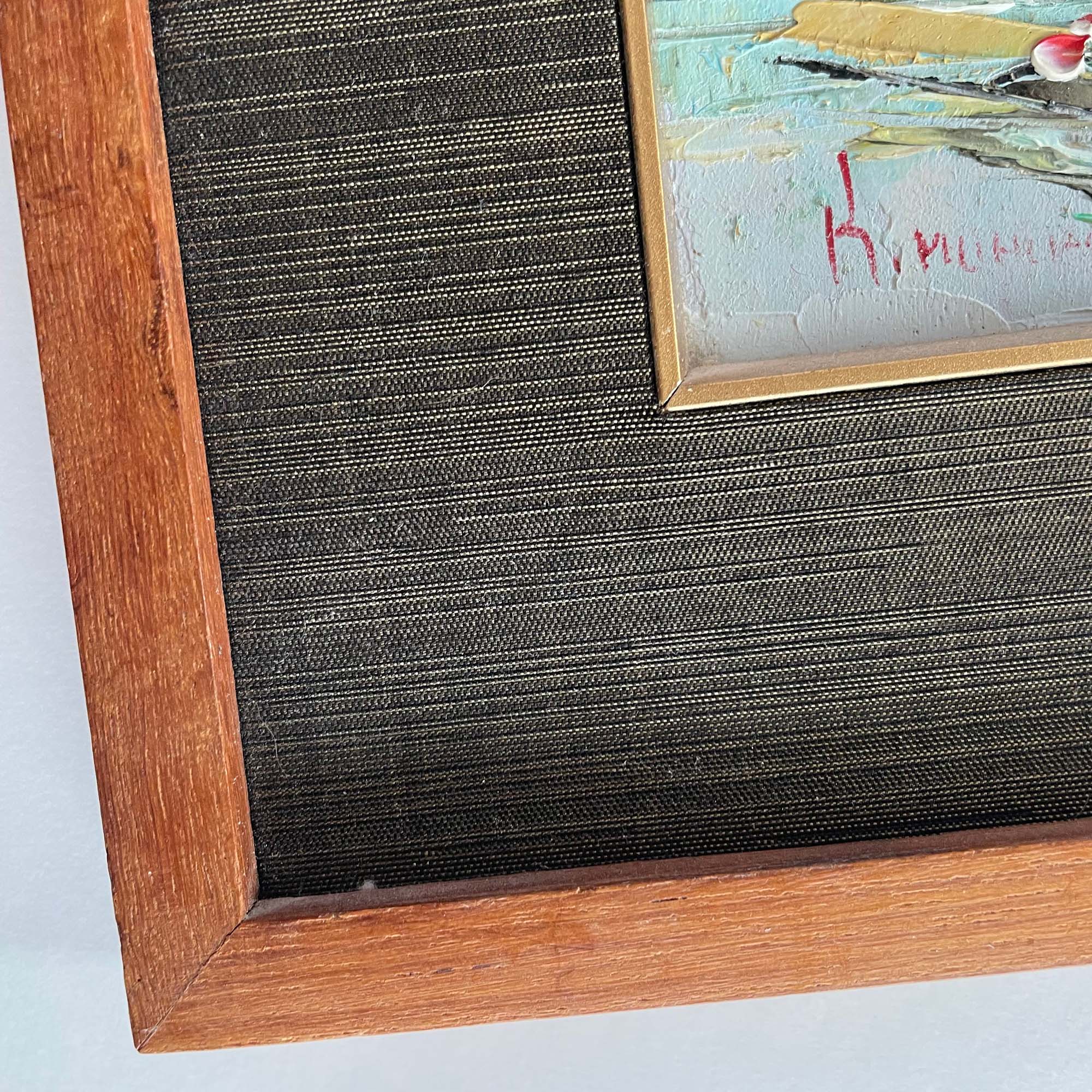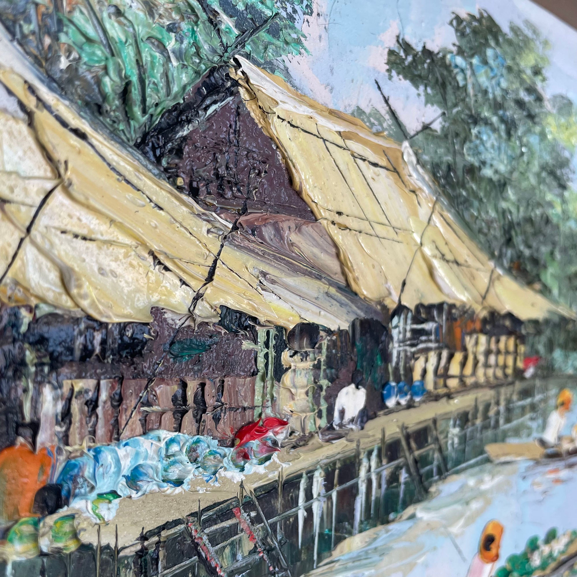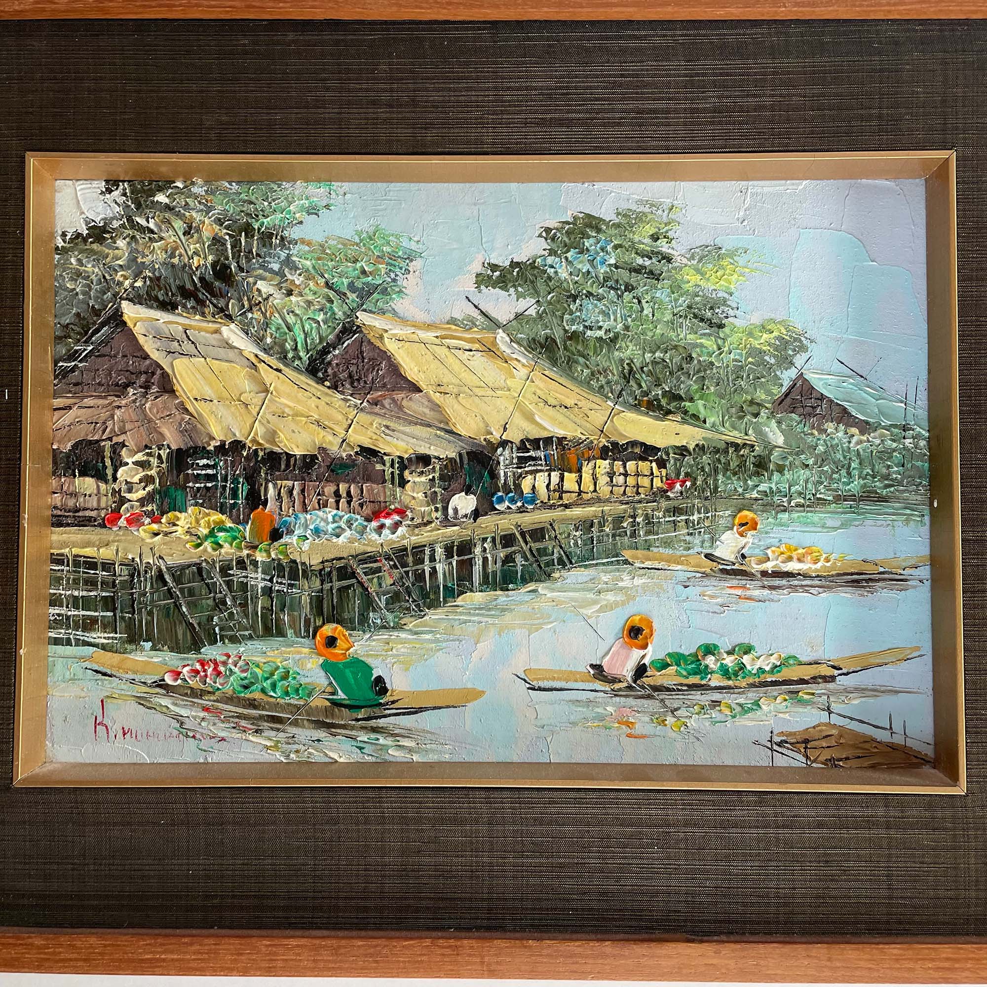 Oil painting of rural Thai landscape created by Kitilerk Muhummad. He is a well known painter that exhibited his work in major exhibits in Bangkok during the 1960s and 70s. This canal scene is painted with thick oil paint or heavy imposto giving it an almost 3d appearance.