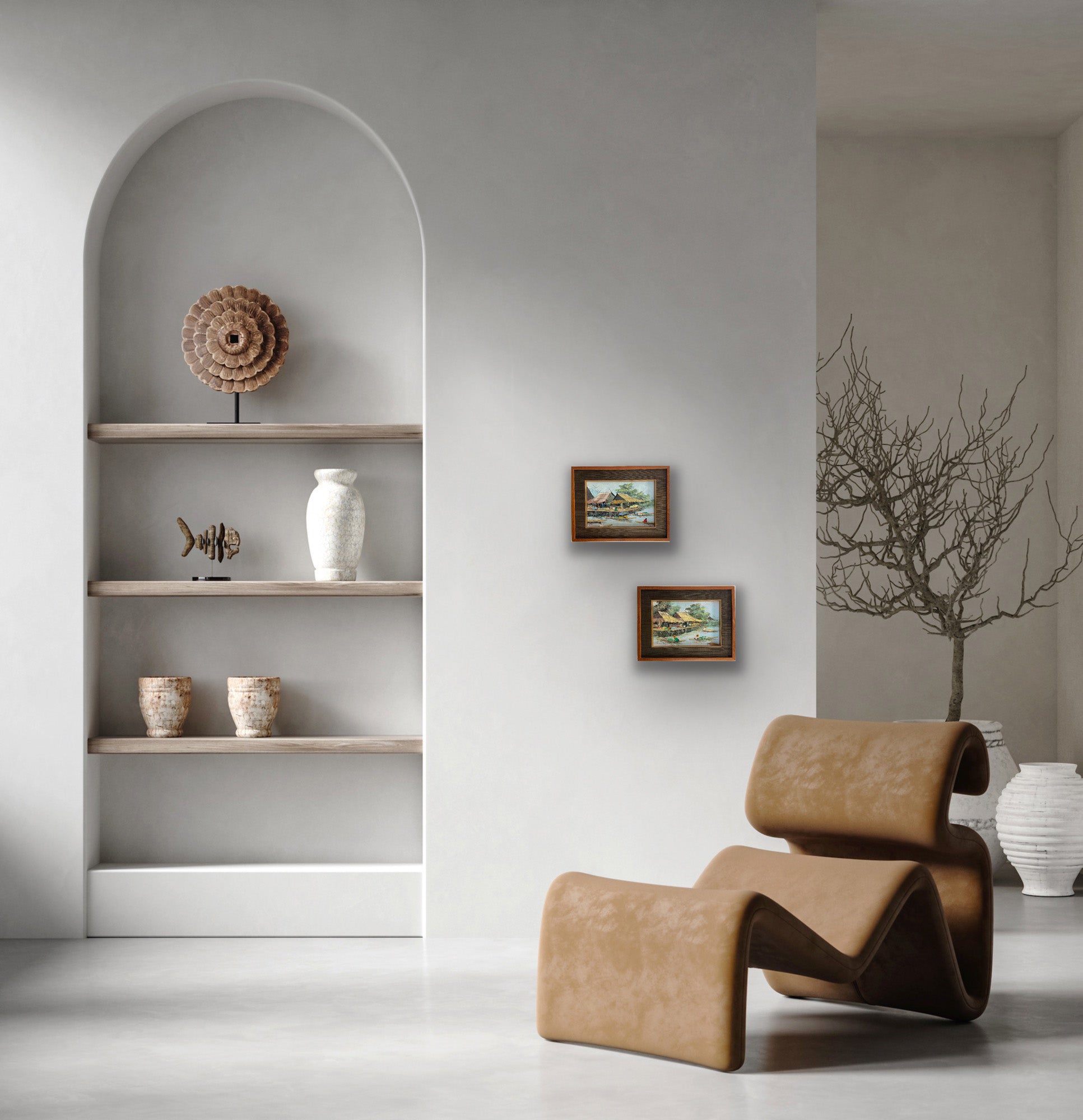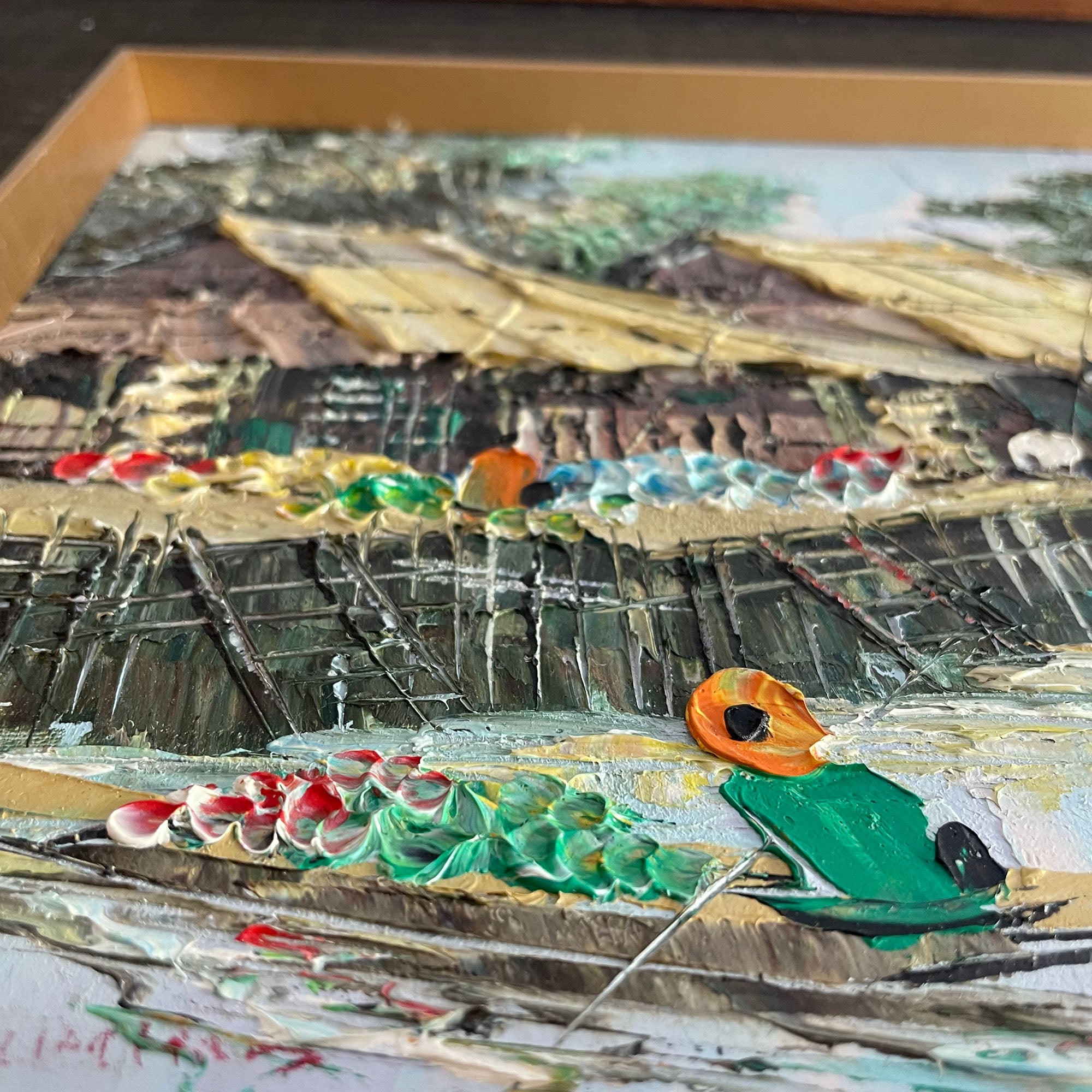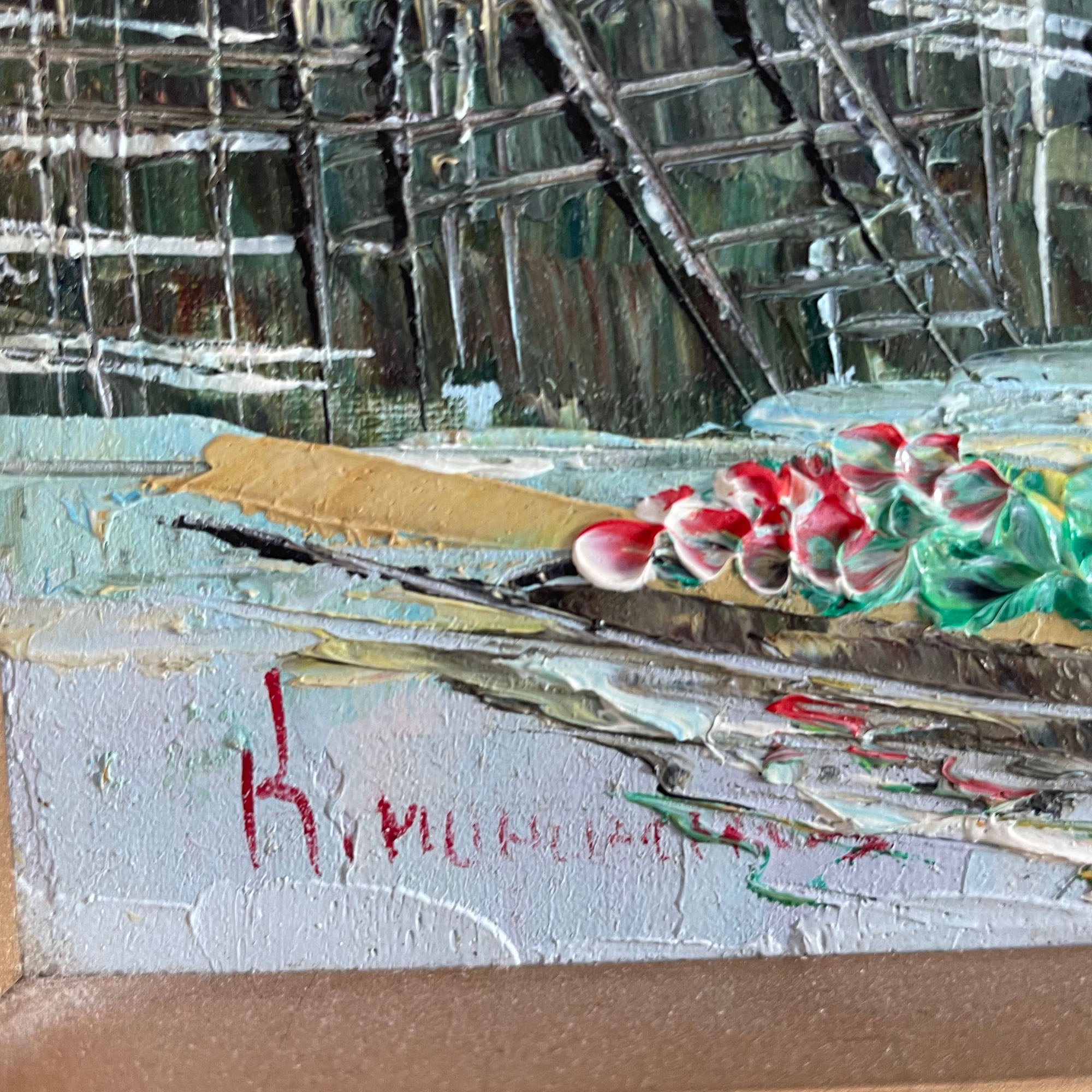 Oil painting of rural Thai landscape created by Kitilerk Muhummad. He is a well known painter that exhibited his work in major exhibits in Bangkok during the 1960s and 70s. This canal scene is painted with thick oil paint or heavy imposto giving it an almost 3d appearance.