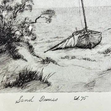 Take home a piece of history with this limited edition drypoint print by WPA artist Ronau William Woiceske. Entitled "Sand Dunes", this nationally recognized artist who worked for WPA, captures the serene beauty of a forgotten sailboat on a windblown beach. Printed on heavy art paper, this circa 1930 piece is a must-have for any art collector.