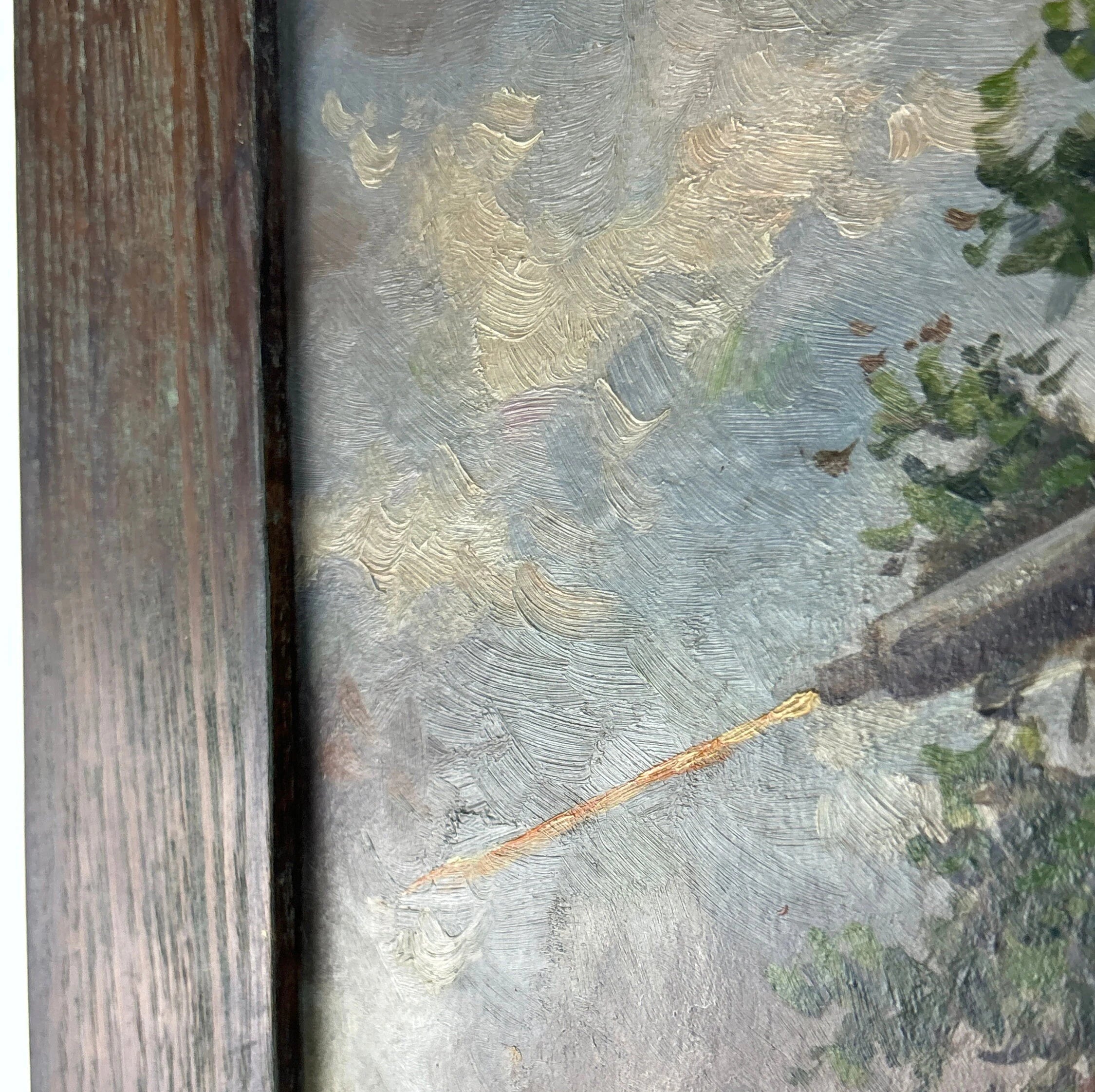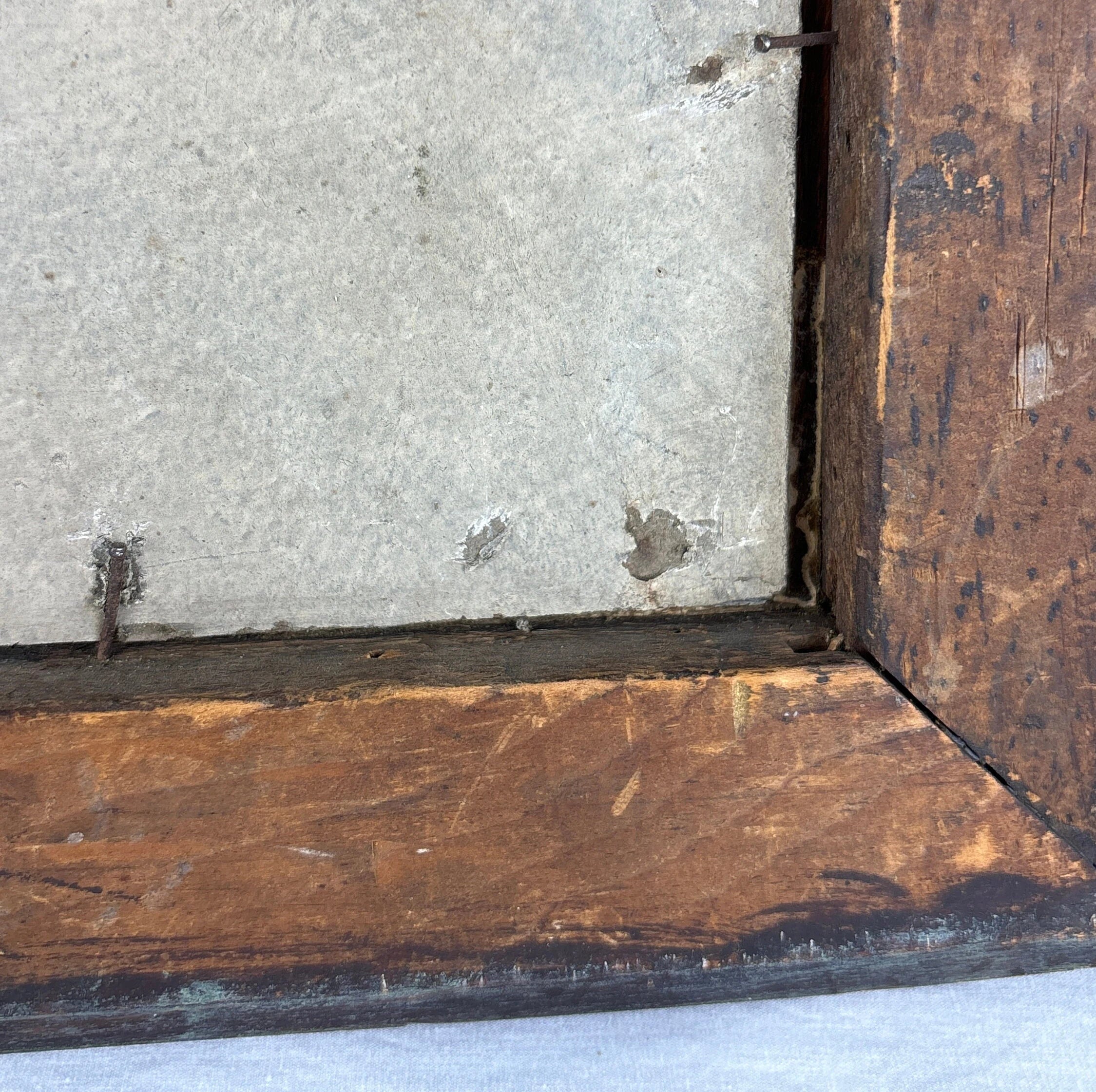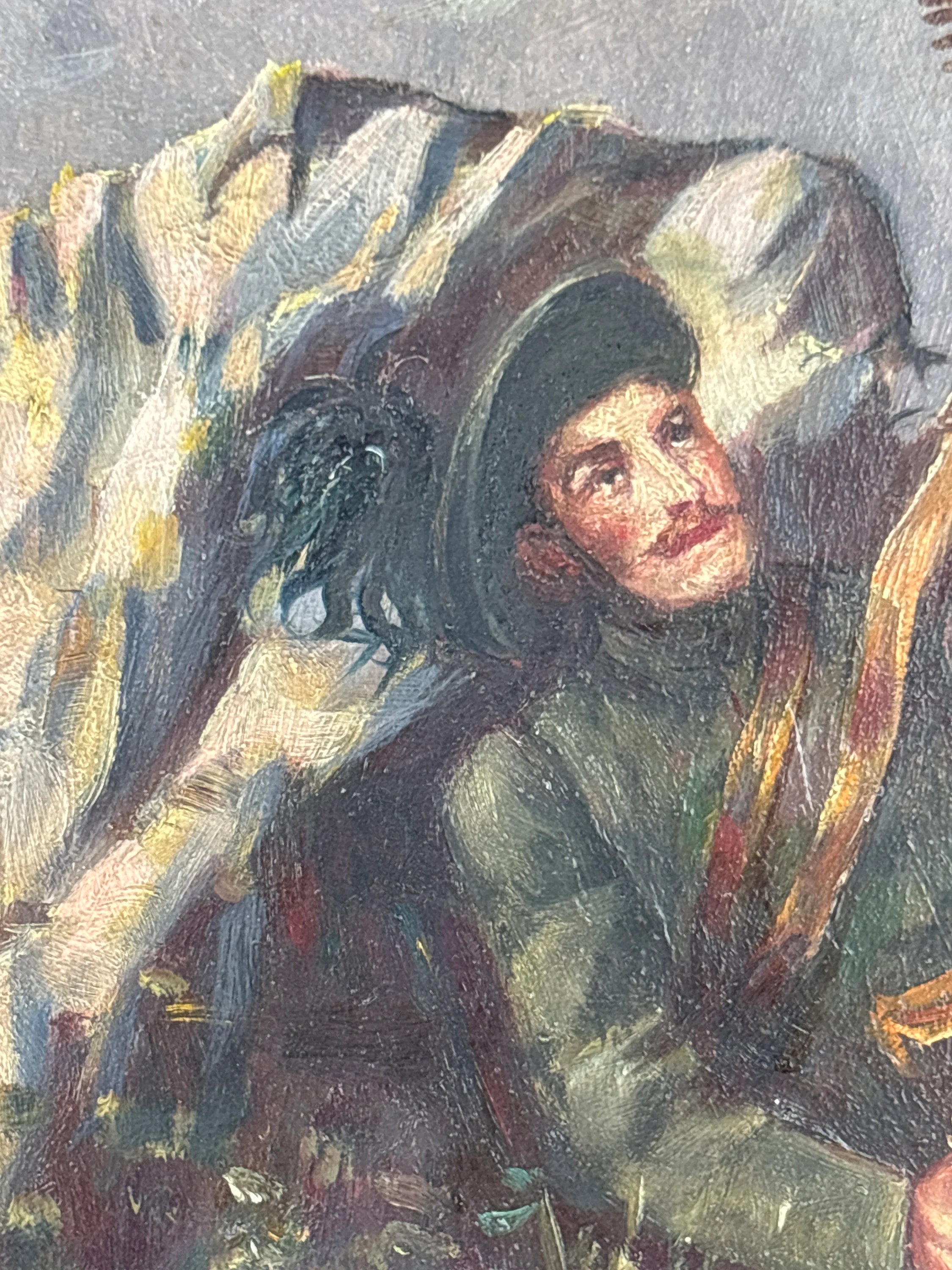 Painting is in great vintage condition . Frame is in good condition but the painting is held to the frame with nails and not completely secure in the frame.