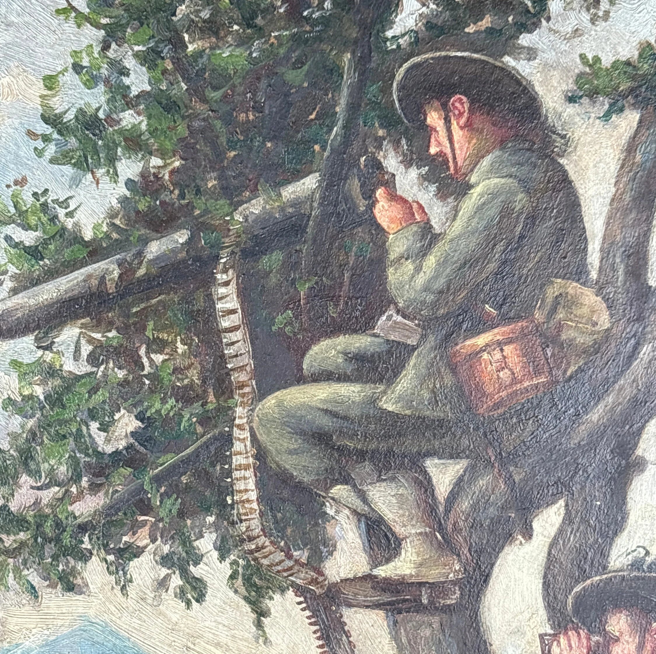 This is an original vintage oil painting of a WWI war scene. It depicts four italian military men shooting a machine gun from a tree in the Alps. The painting is unsigned and I believe it is a copy of a painting by Fortunino Matania.