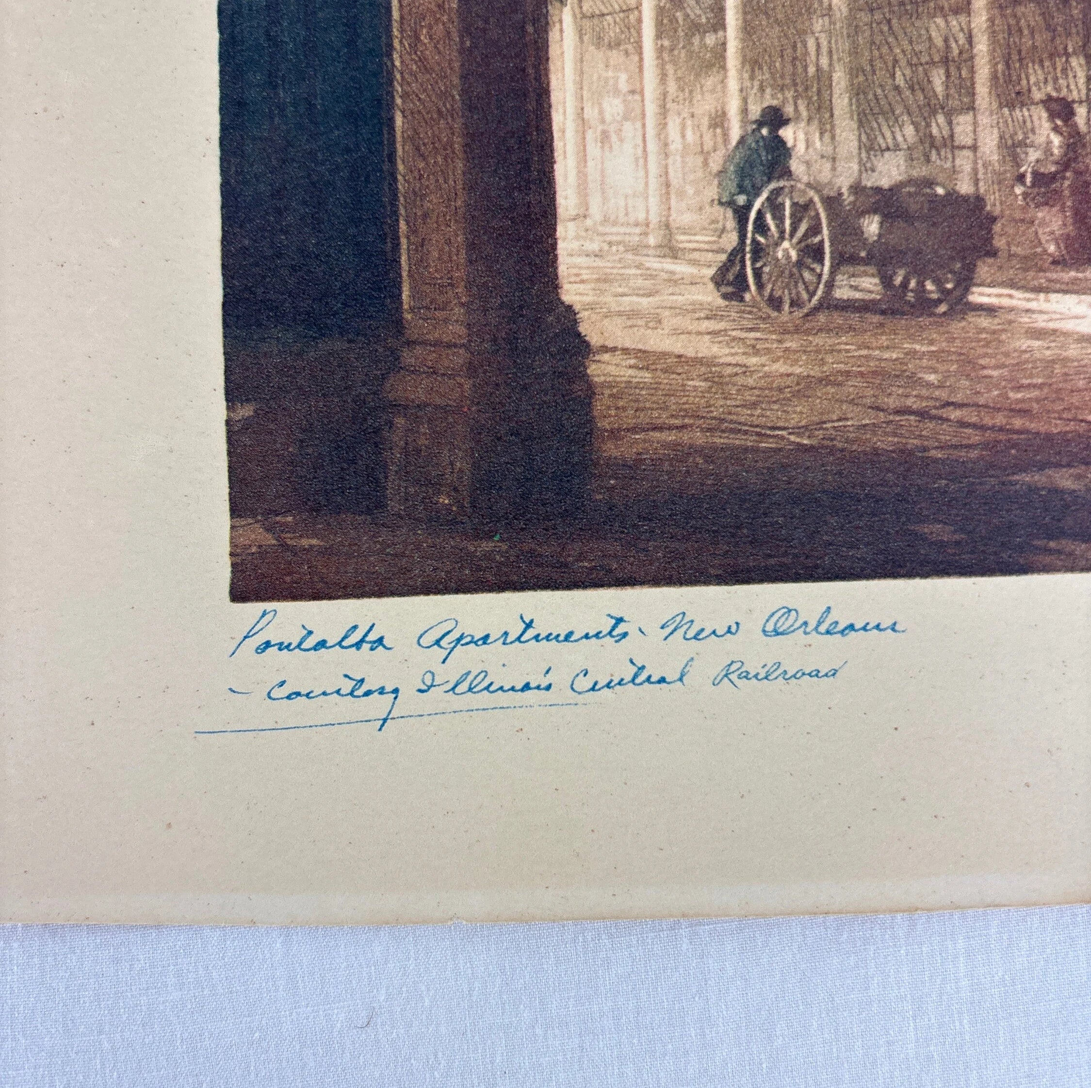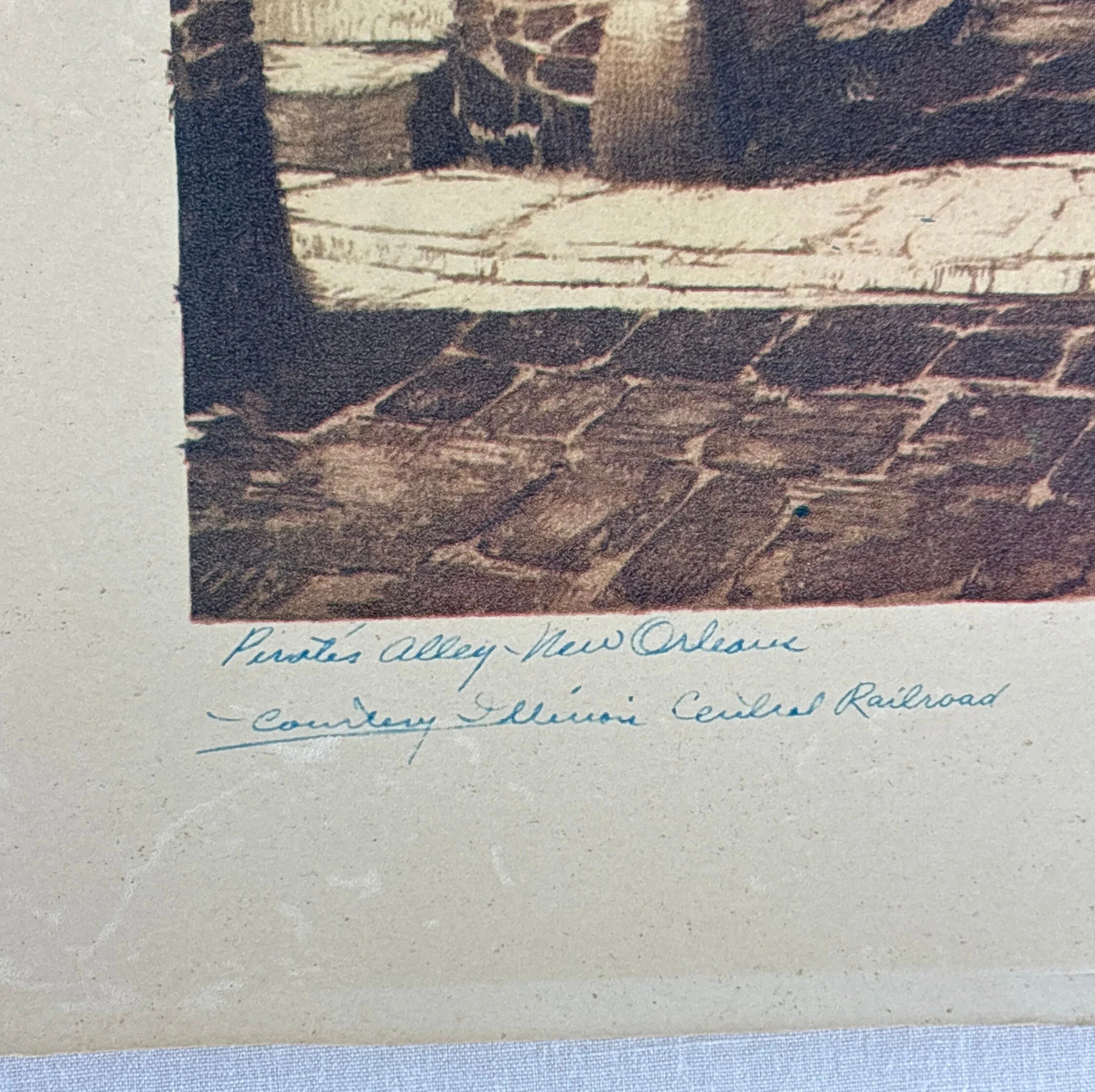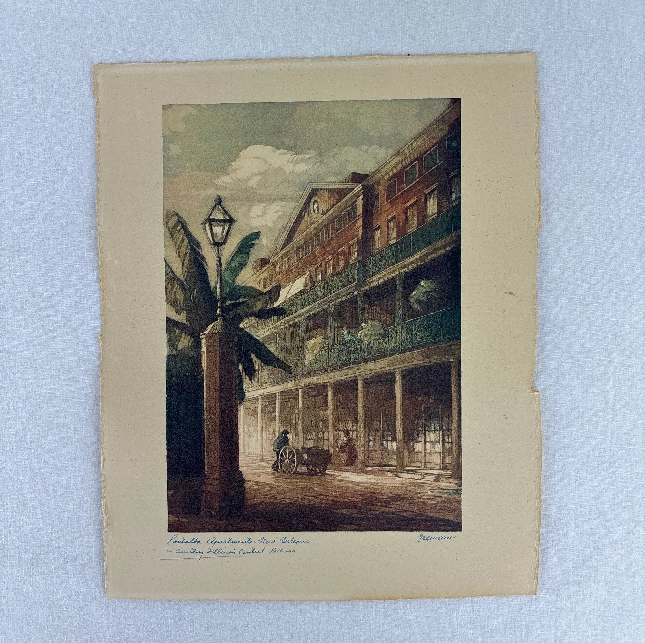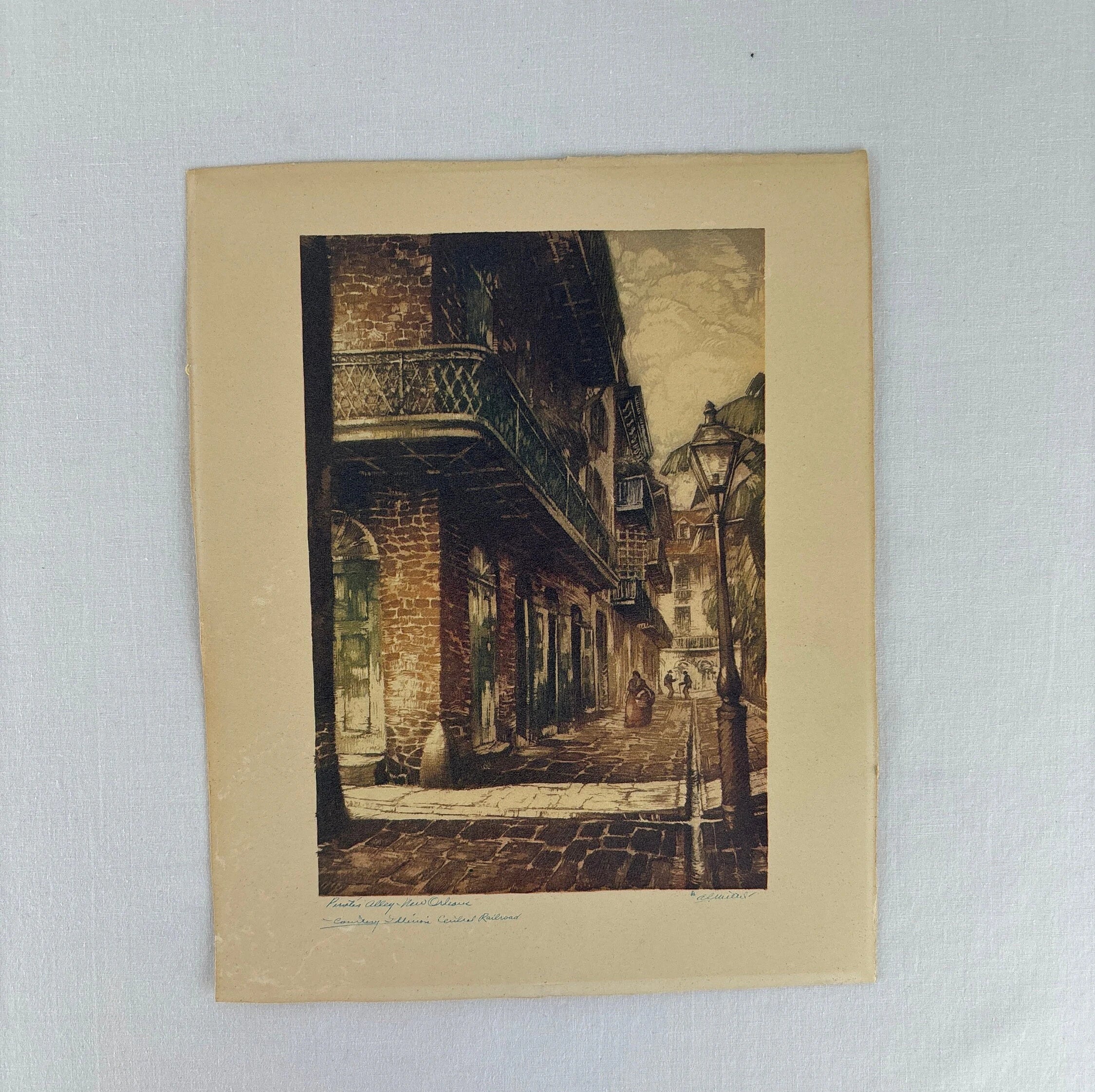 There are two lithograph images of New Orleans signed by Al Mettel in this lot. They were created for the County Illinois Central Railroad circa 1960s. They depict Pirates Alley and Pontalba apartments both in New Orleans.