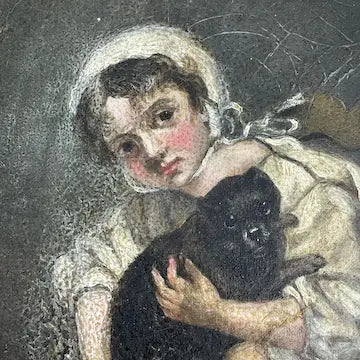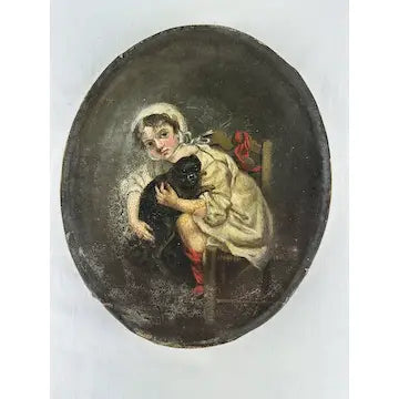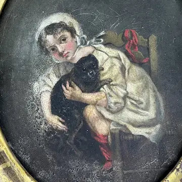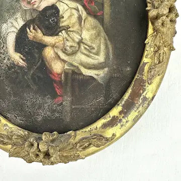 This antique Victorian oil painting on canvas features a charming image of a girl and her dog, beautifully captured in an ornate gilded frame with delicate floral details. Perfect for adding a touch of elegance to any space, this piece is a timeless addition to any art collection.