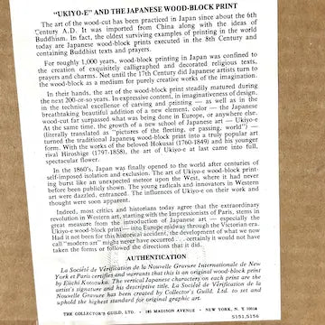 Experience the beauty and craftsmanship of mid-century Japanese art with this vintage woodblock print featuring blue irises by Eiichi Kotozuka. Published by Uchida in Kyoto, this authenticated piece comes with a stamp from The Collectors Guild Ltd. A must-have for any art enthusiast.