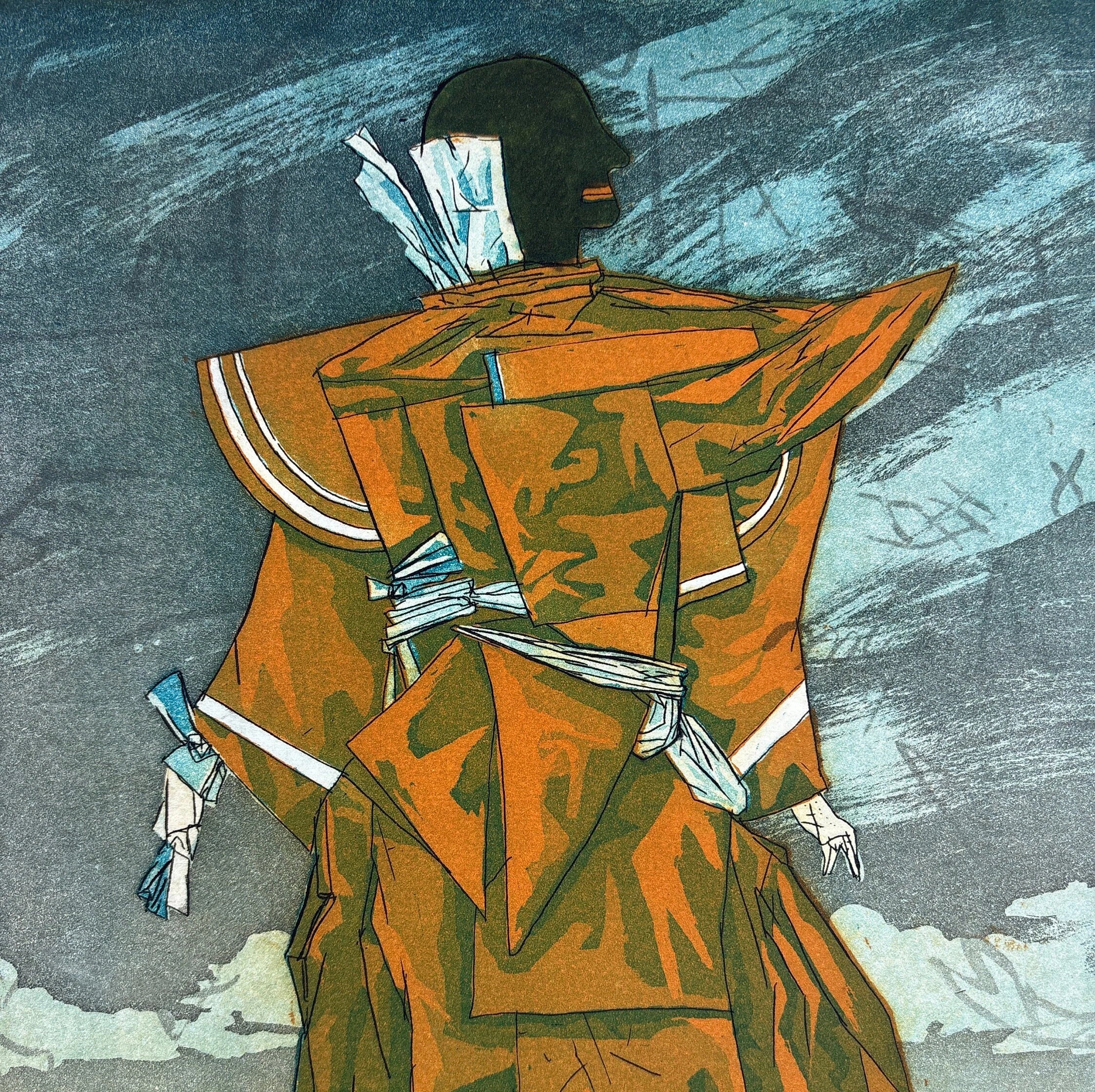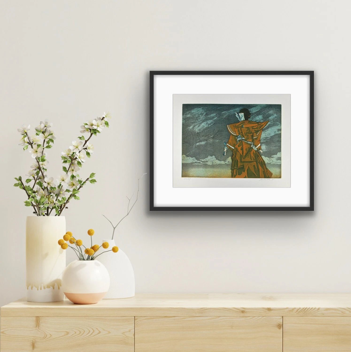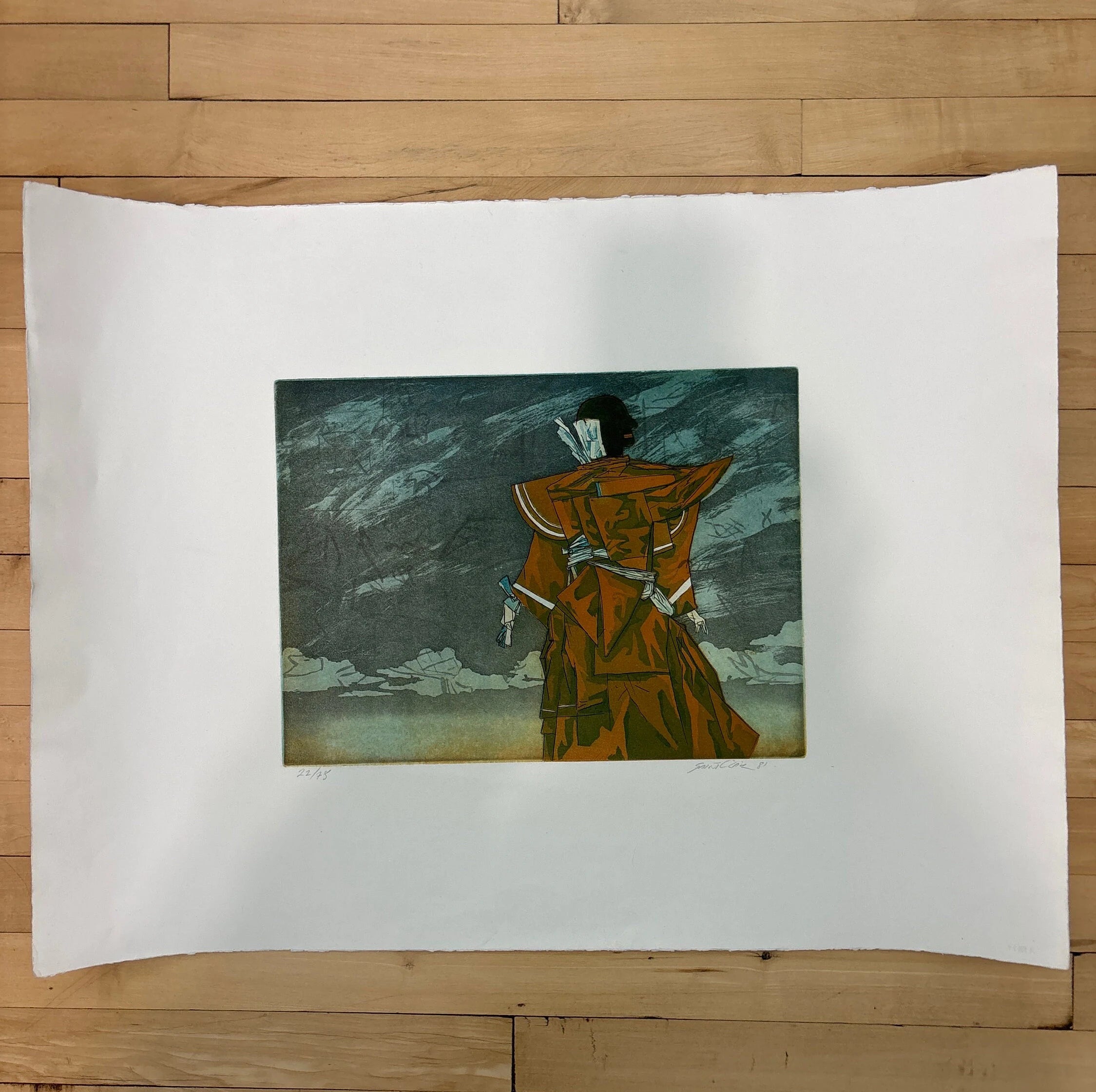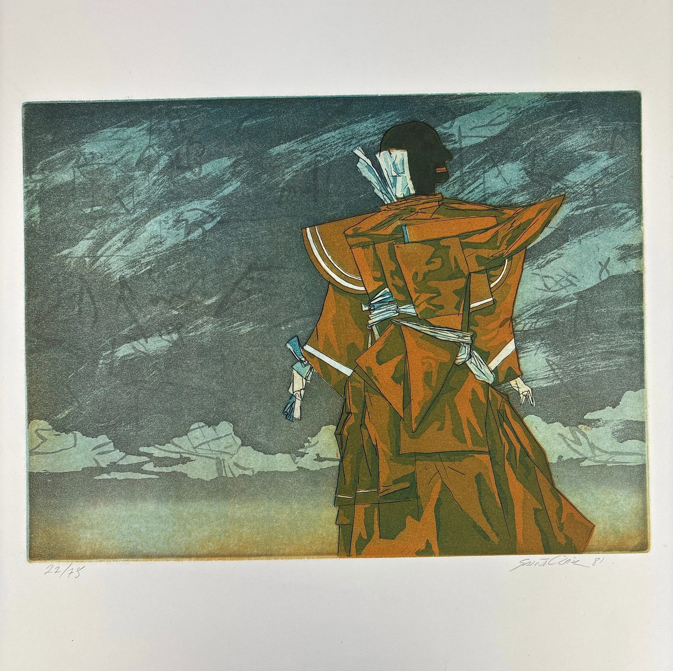 This is a vintage etching print by Saint Clair Cemin born 1951. He is considered an international post modern artist living and working in New York and Beijing. His work can be found in the Museum of Contemporary Art in Los Angeles, Whitney Museum of Art, as well as installations in Illinois, Sweden, Norway, Brazil to name a few. This image is of a man in Samurai costume.