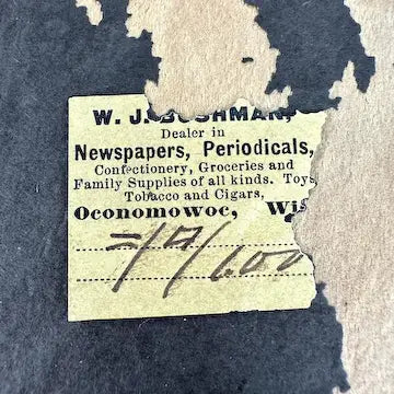 On the bottom is an original store tag. It is partially torn but you can still see that it came from WJ Bushman in Oconomowoc Wisconsin.