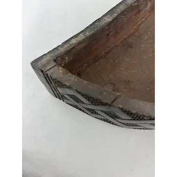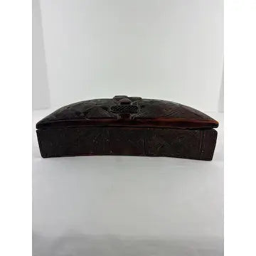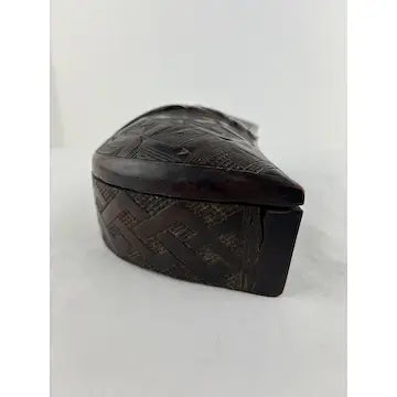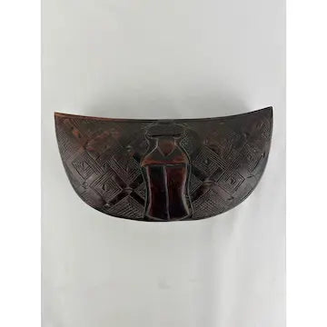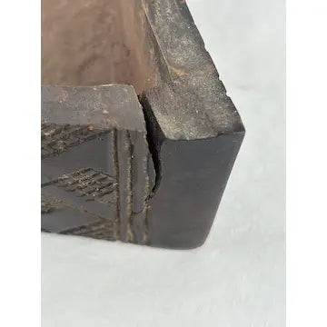 Expertly hand carved by the African Kuba tribe, this antique Tukula box is a unique addition to any collection. Made from dark wood with a striking geometric pattern, it was perfect for storing tukula powder that women used to decorate their faces. Own a piece of African craftsmanship today.