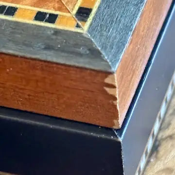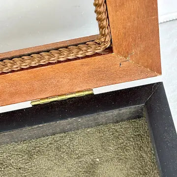 This is in good condition. Hinges are secure, glass is unscratched. There are some stains or discoloration on the felt inside and some nicks on the corner of the lid.