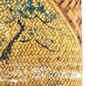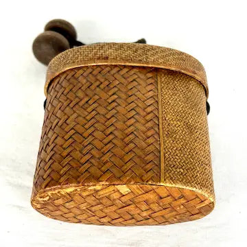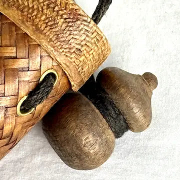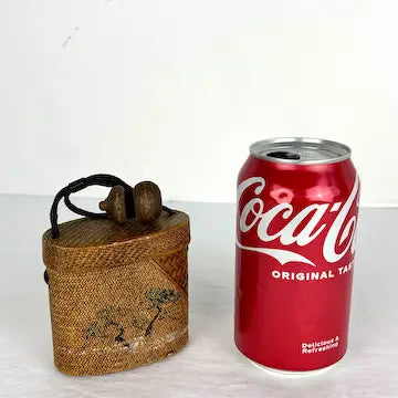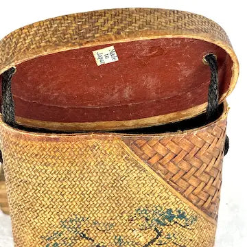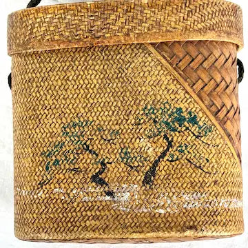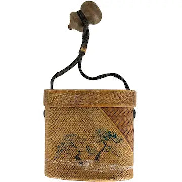 This vintage tobacco pouch is hand woven from bamboo in traditional Japanese style, featuring various weaving patterns. The lidded pouch is adorned with a beautifully hand painted landscape scene, and includes a cord and wood toggle which would have been traditionally tied to a belt. Add a touch of culture to your smoking experience.