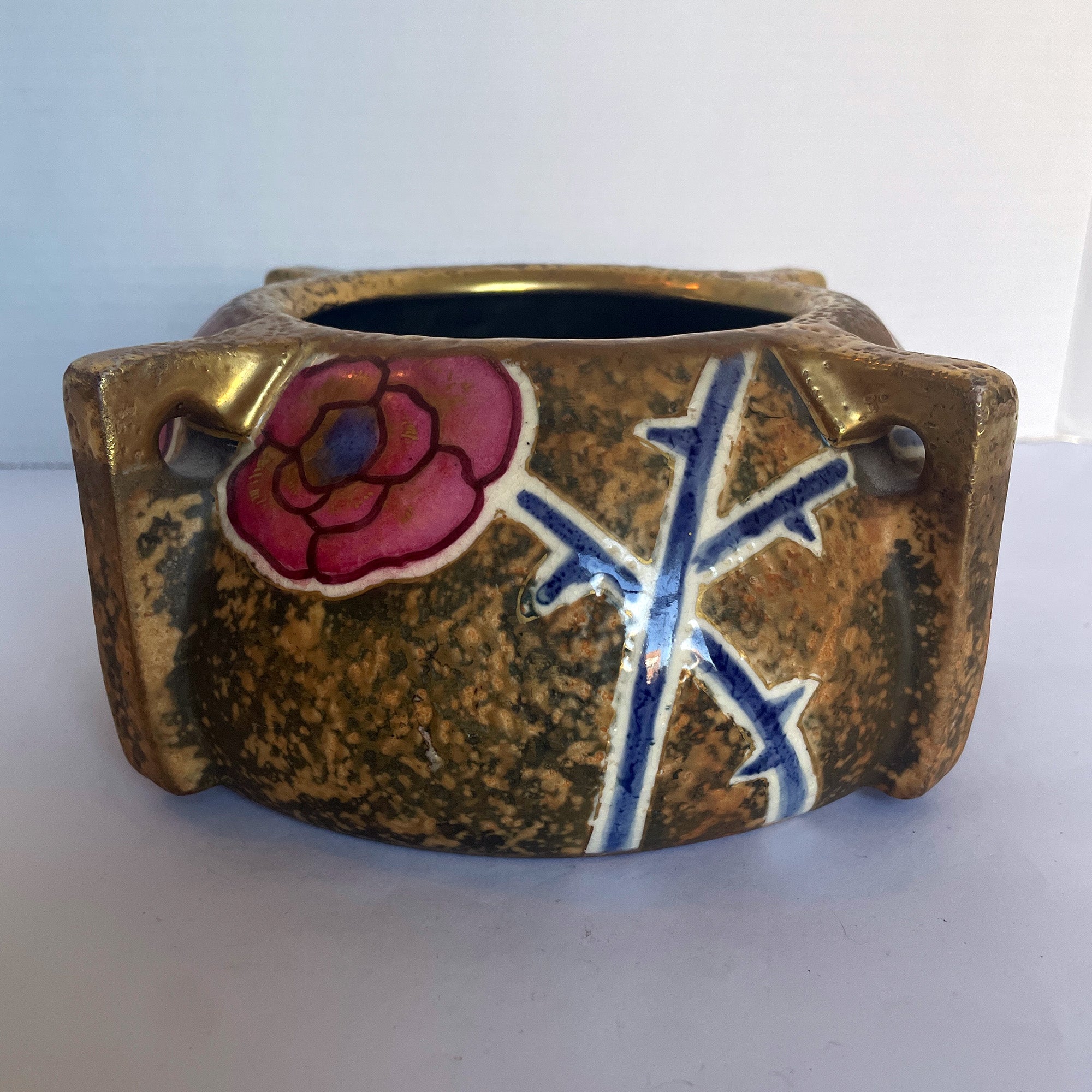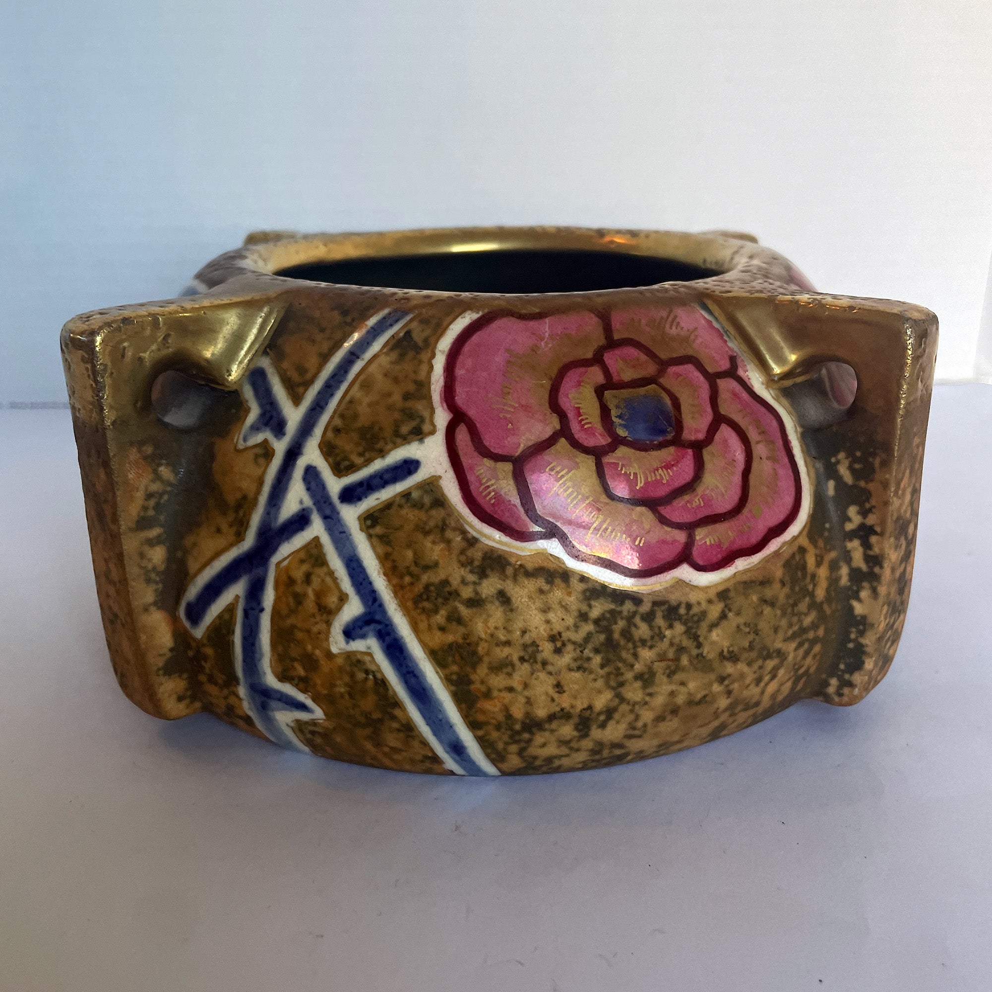 This is a beautiful Art Nouveau Amphora Austria vase decorated with a rose and rose hip motif. It has a mottled gold tone background with pink roses and blue vines. The rim and top of the handles have a gilded gold finish.