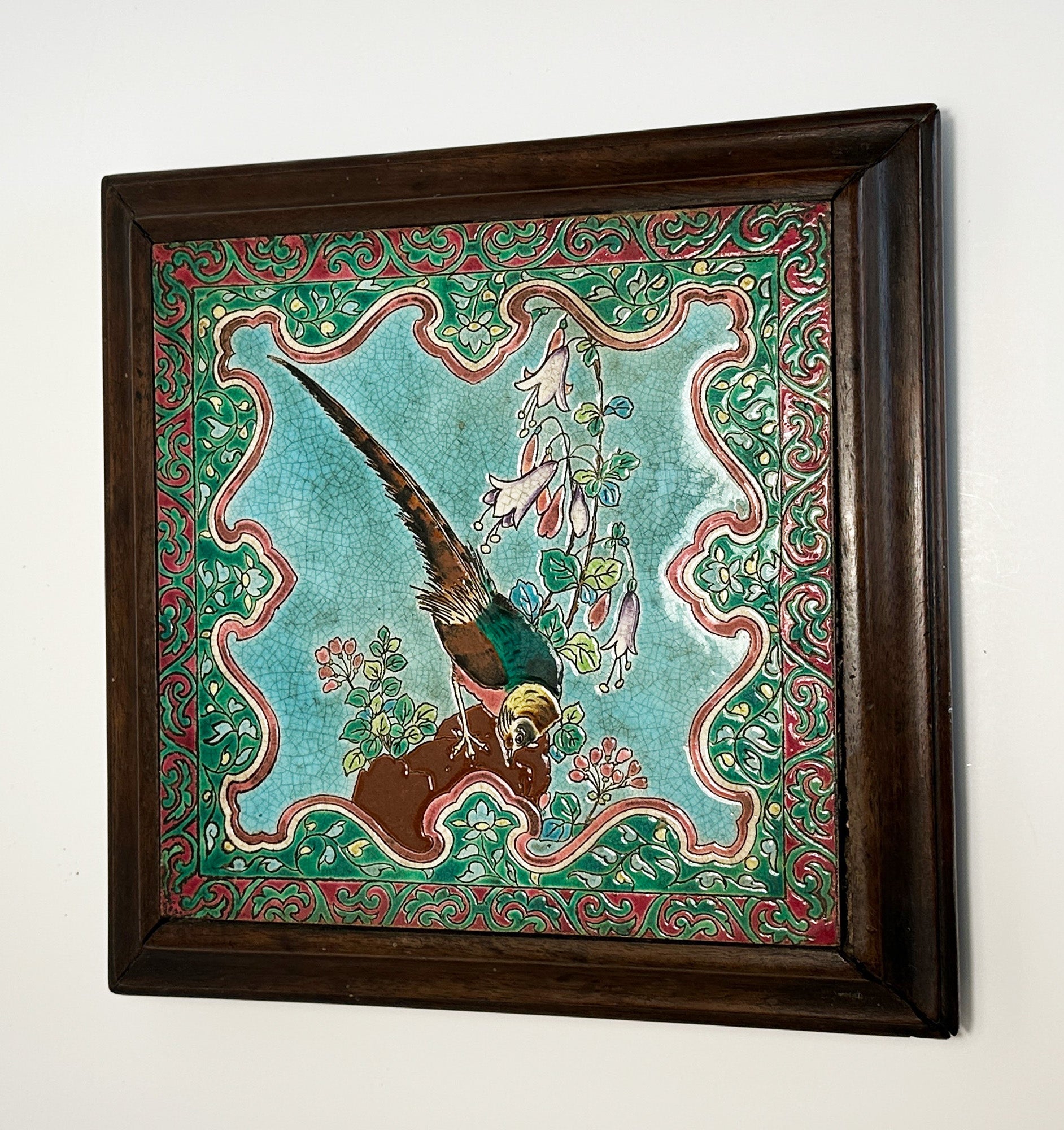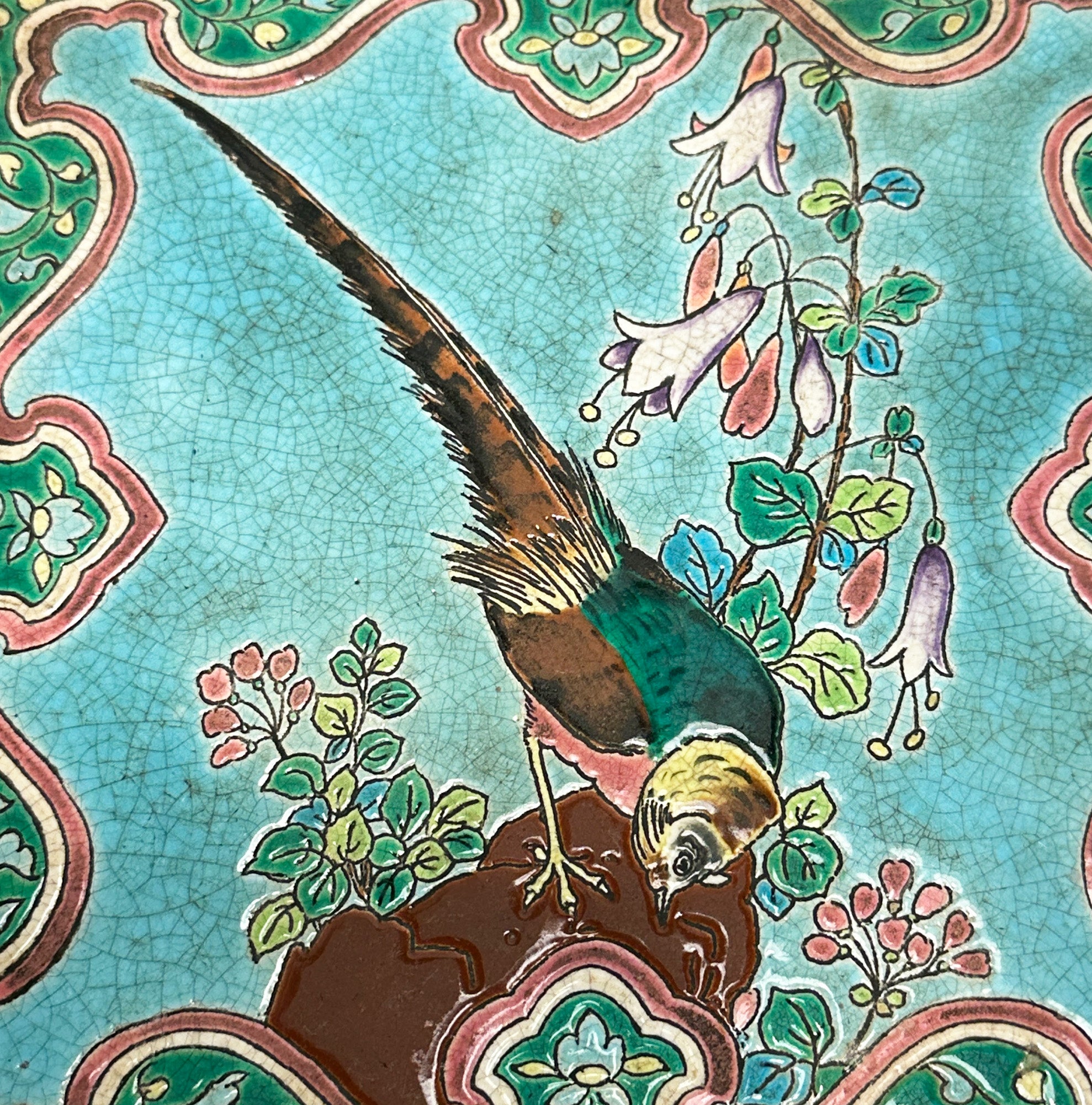 Antique French Longwy Enamel Tile Pheasant Trivet