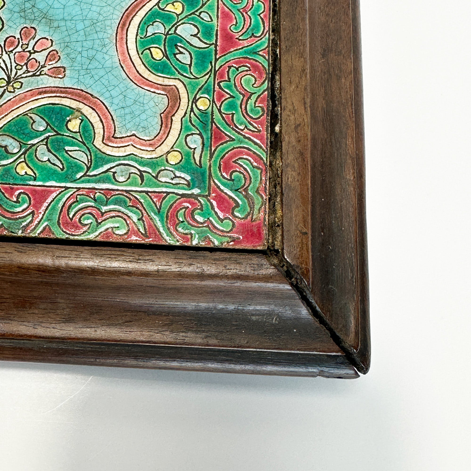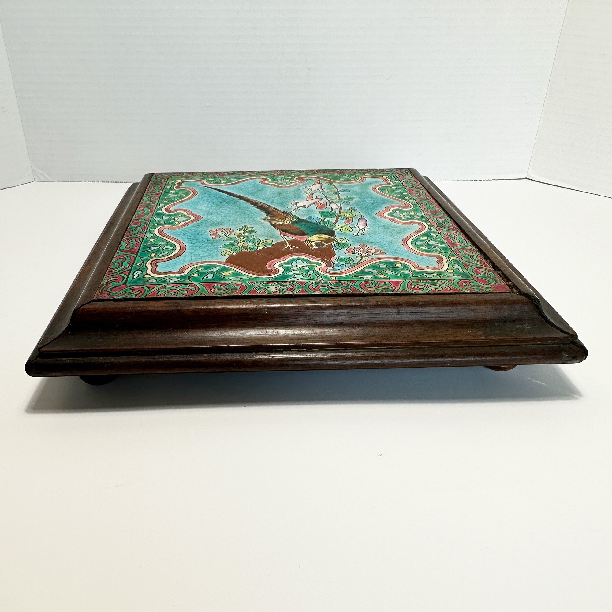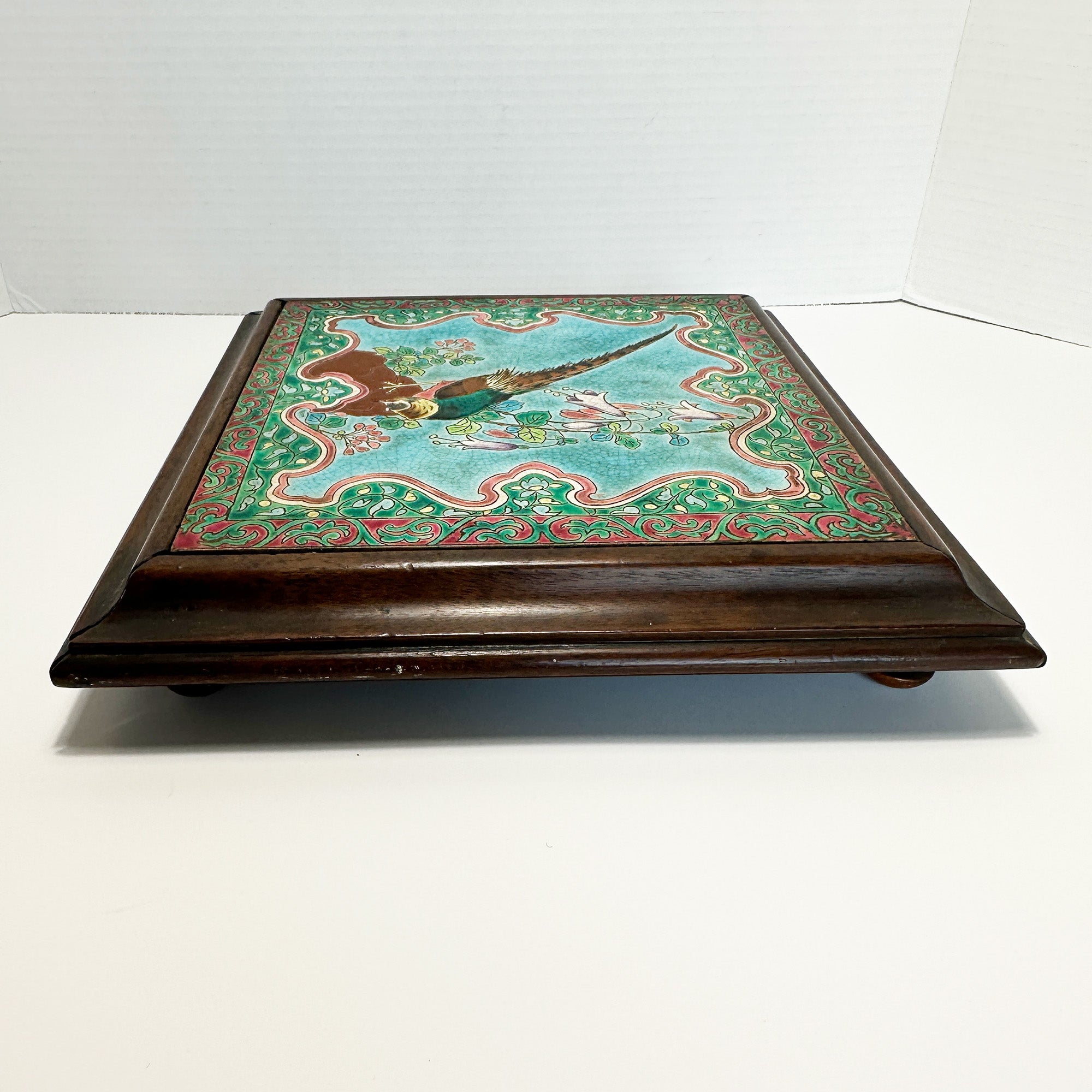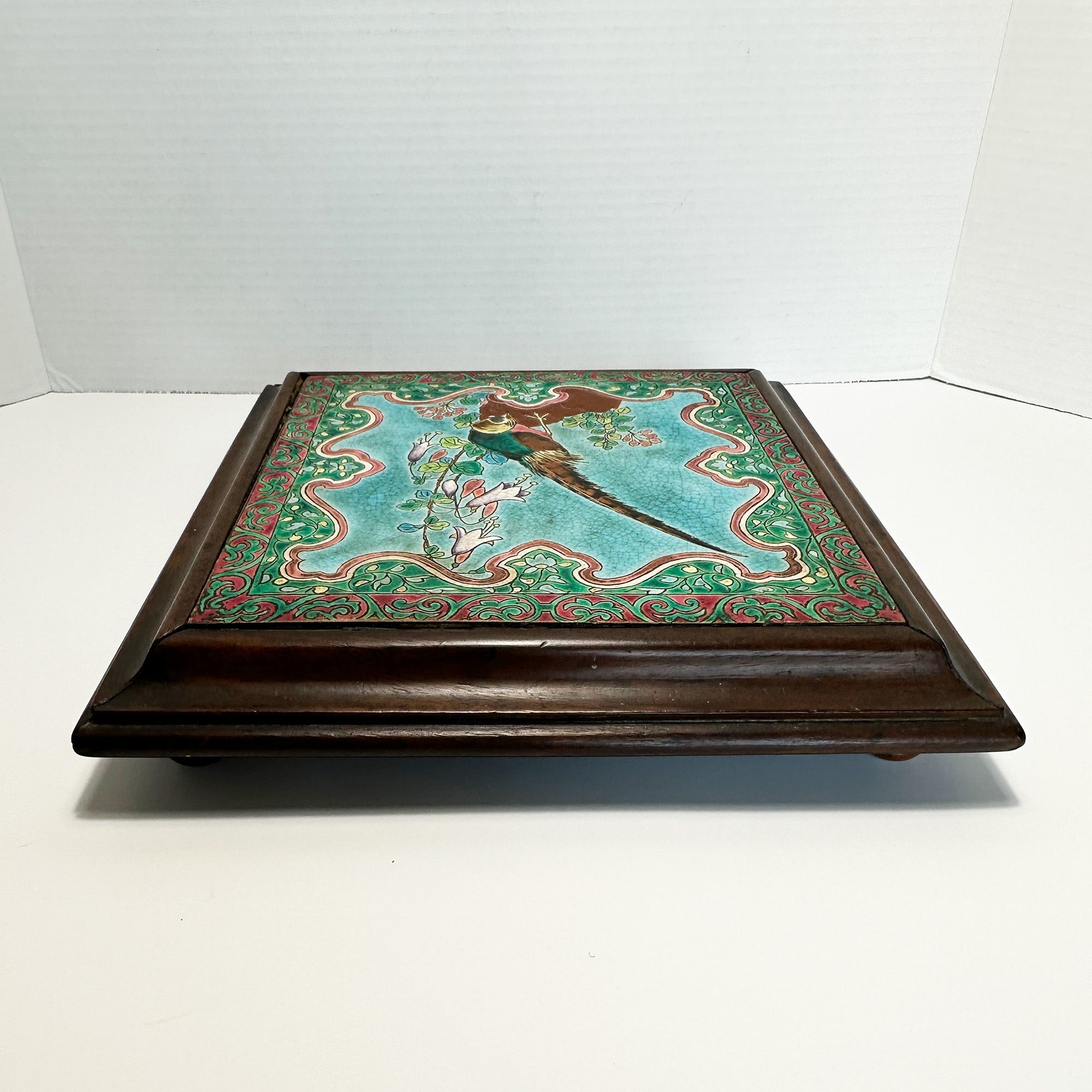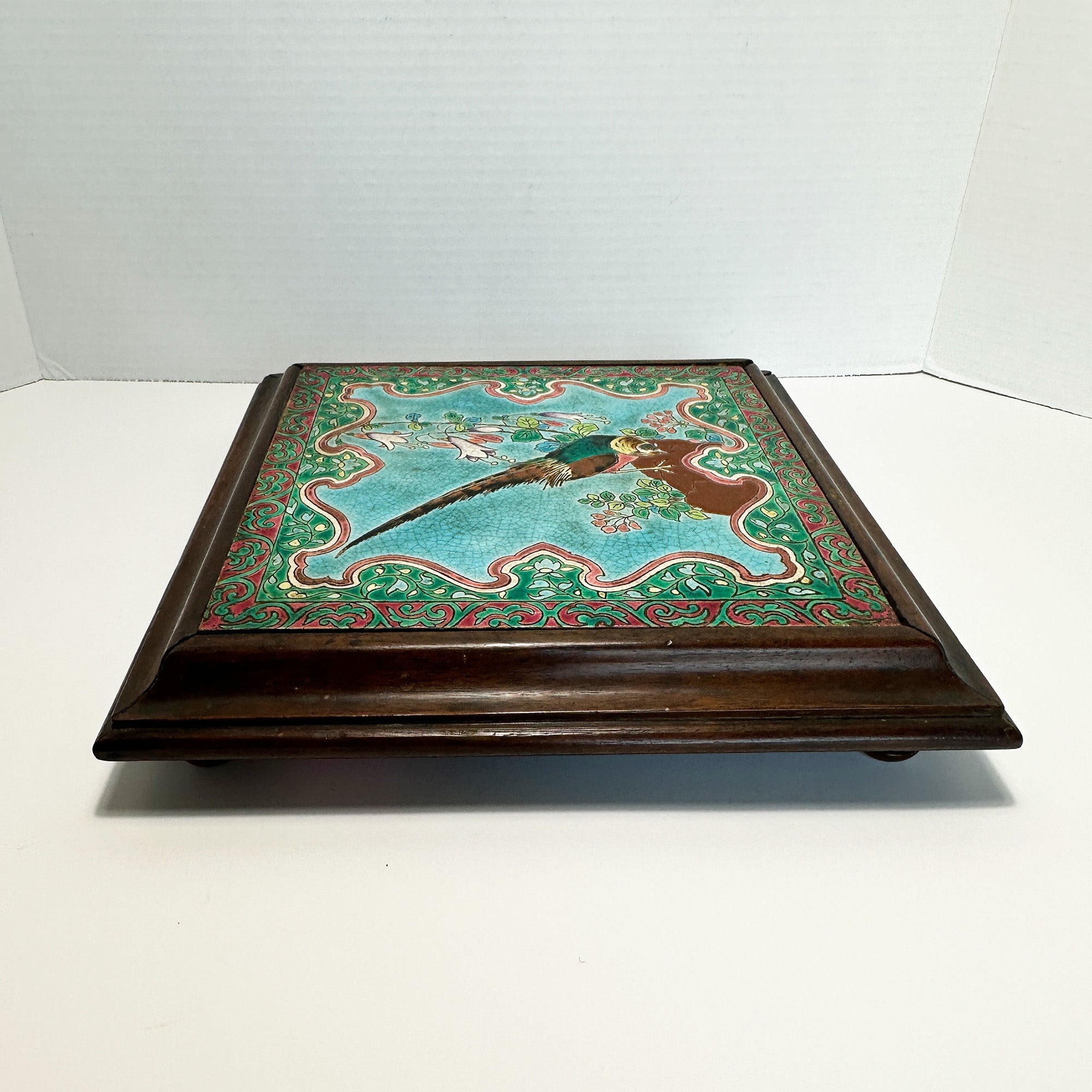 This beautiful enameled tile trivet is set in wood frame with small wood feet to raise it off the table. It has an intricate pheasant and flower motif. Possibly French Emaux de Longwy.
