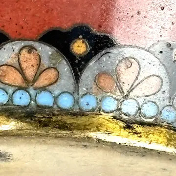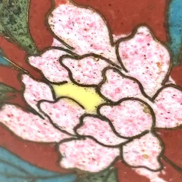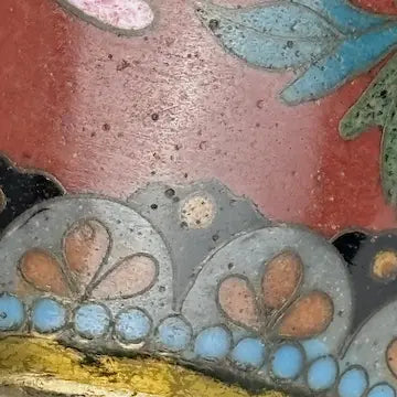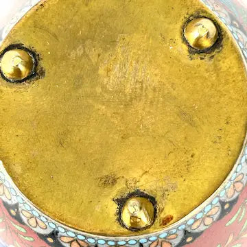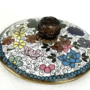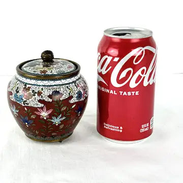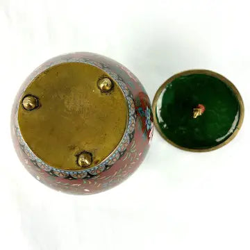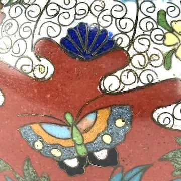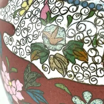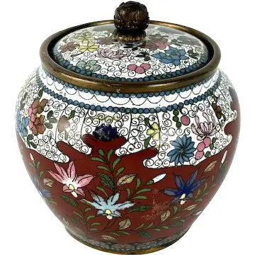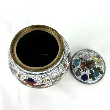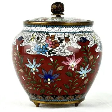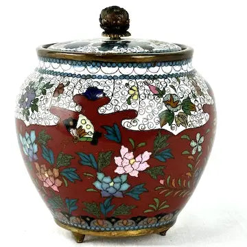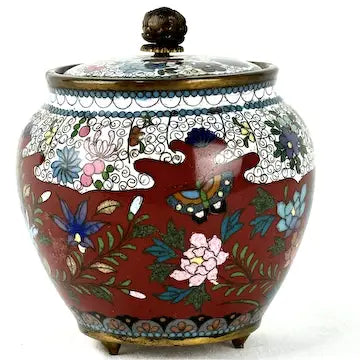 This antique Japanese White and Red Cloisonne Footed Jar boasts intricate floral and butterfly designs, showcasing the skilled craftsmanship of the Kyoto School. Made of copper with a delicate copper finial, this round jar will make a stunning addition to any collection.