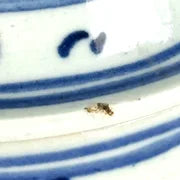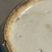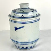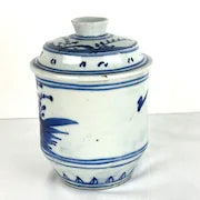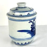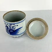 Container is in good antique condition with some patina. There is a very small chip on the edge of the lid and a chip on the inside lip of the jar
