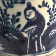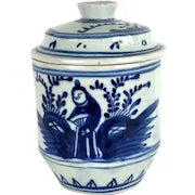 This antique jar is from the Qing dynasty, handcrafted in porcelain, it features a delicate garden scene with a woman and a fan in colbalt blue. Dating back to the late 1800s/early 1900s, this lidded ginger jar is a luxurious addition to any collection. Own a piece of Chinese history and elegance.