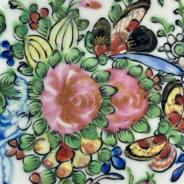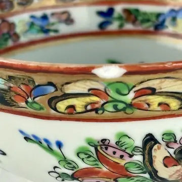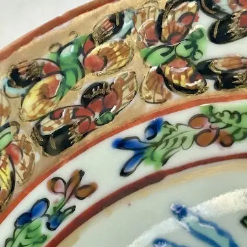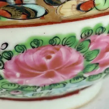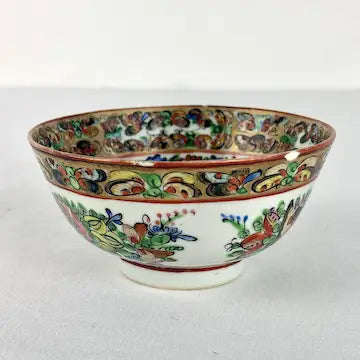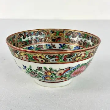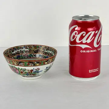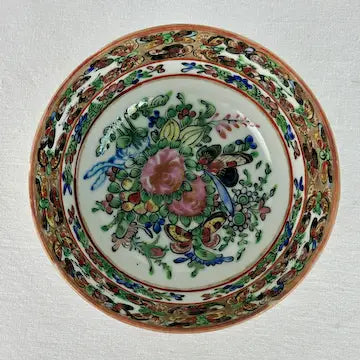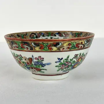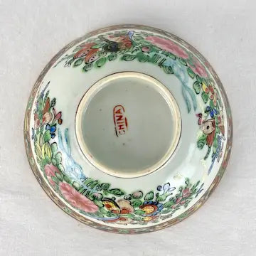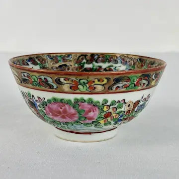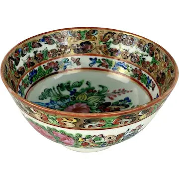 This early 20th century Chinese porcelain bowl features a beautifully detailed 1000 butterflies pattern and traditional rose medallion design. A stunning piece for any collection, this bowl showcases fine Chinese craftsmanship and artistic skill.