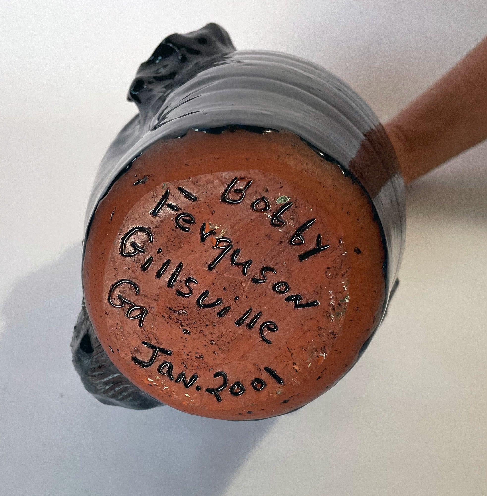 This collectible, unique folk face jug was made in 2001. It was created in Gillsville, GA by Bobby Ferguson who comes from a family of potters. The jug is glazed and sculpted. The teeth add great character to this piece of folk art.