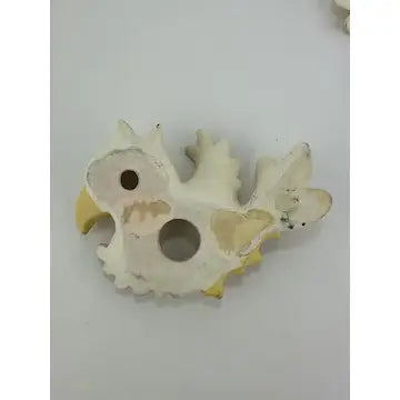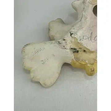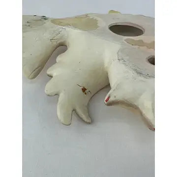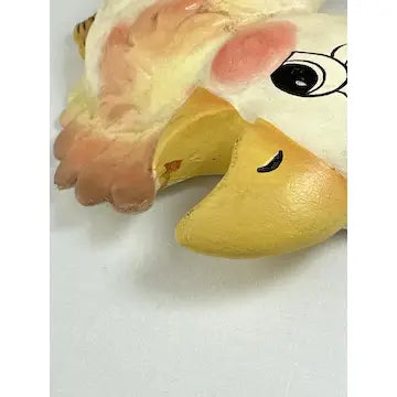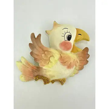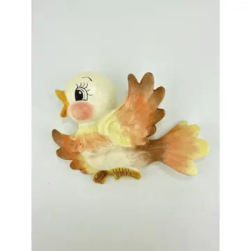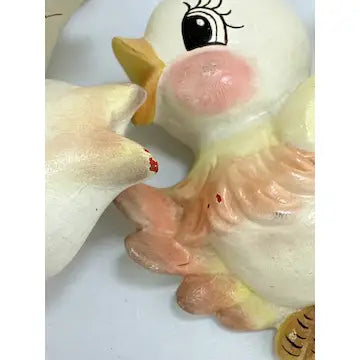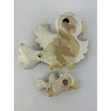 Mama bird has the top piece of paper from drywall stuck to her back. (They might have used double stick tape to stick her to the wall.) you do not see this from the front. There are also a few small areas here and there where the top layer of paint is missing and the paint underneath shows through. Very little of this stands out when they are hung on the wall. The birds themselves are in great condition with no chips cracks or breaks.
