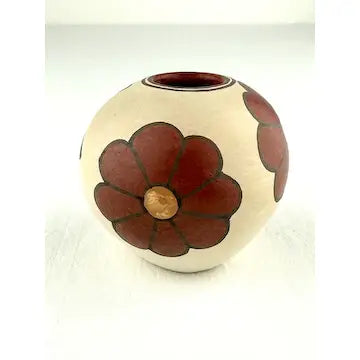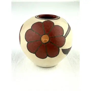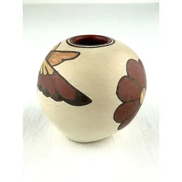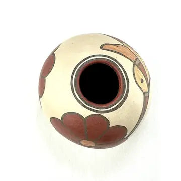 This stunning miniature humming bird pottery was handcrafted by Santa Clara Pueblo artist Lois Gutierrez in 2009, featuring flowers and a hummingbird in polychrome colors. It is signed and dated. Lois’ work has won numerous awards and been featured in many books. Made with traditional techniques, it is a beautiful representation of Native American art. Bring a piece of indigenous culture into your home with this unique piece.