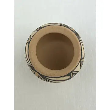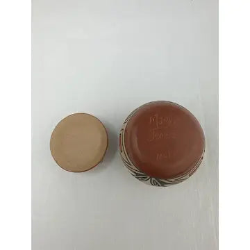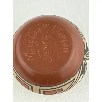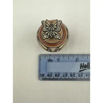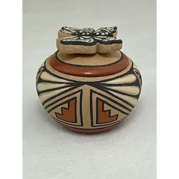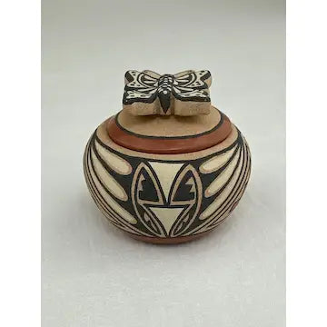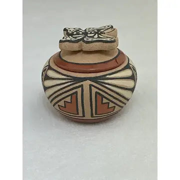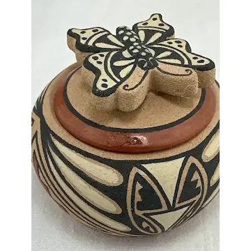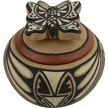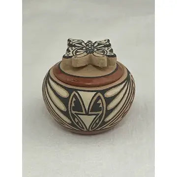 This Mary Eteeyan miniature butterfly pot is a stunning piece of Native American pottery, handcrafted by Mary Louise Eteeyan of Jemez Pueblo in New Mexico. This artful little polychrome bowl features painted native geometric designs on the pot. It is topped with a painted and sculpted butterfly on the lid. The intricate designs add a touch of cultural authenticity to any space. Experience the beauty and tradition of Native American art with this one-of-a-kind piece.