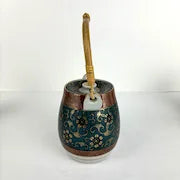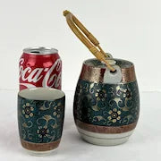 Teapot is 3” x 5” x 8” tall. Each cup is 2.5” dia x 3.5” tall