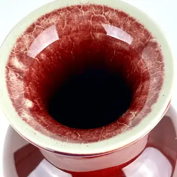 This sand de boef vase is a vintage masterpiece from Jingdezhen, China. Made of porcelain, it features a creamy white lip and oxblood red glaze, showcasing the beauty of traditional Chinese craftsmanship. An antique piece that will add elegance and history to any space.