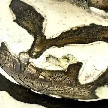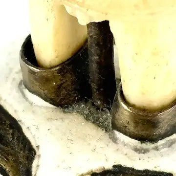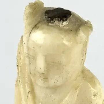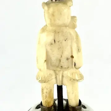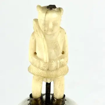 This is in good antique condition with no chips in the bone or body.  The glass bead ringer is still intact