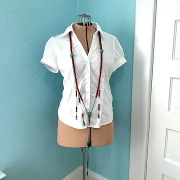 The length of the necklace portion is 48”. Each of the side drops is 7” long. The central drop is 15” long.
