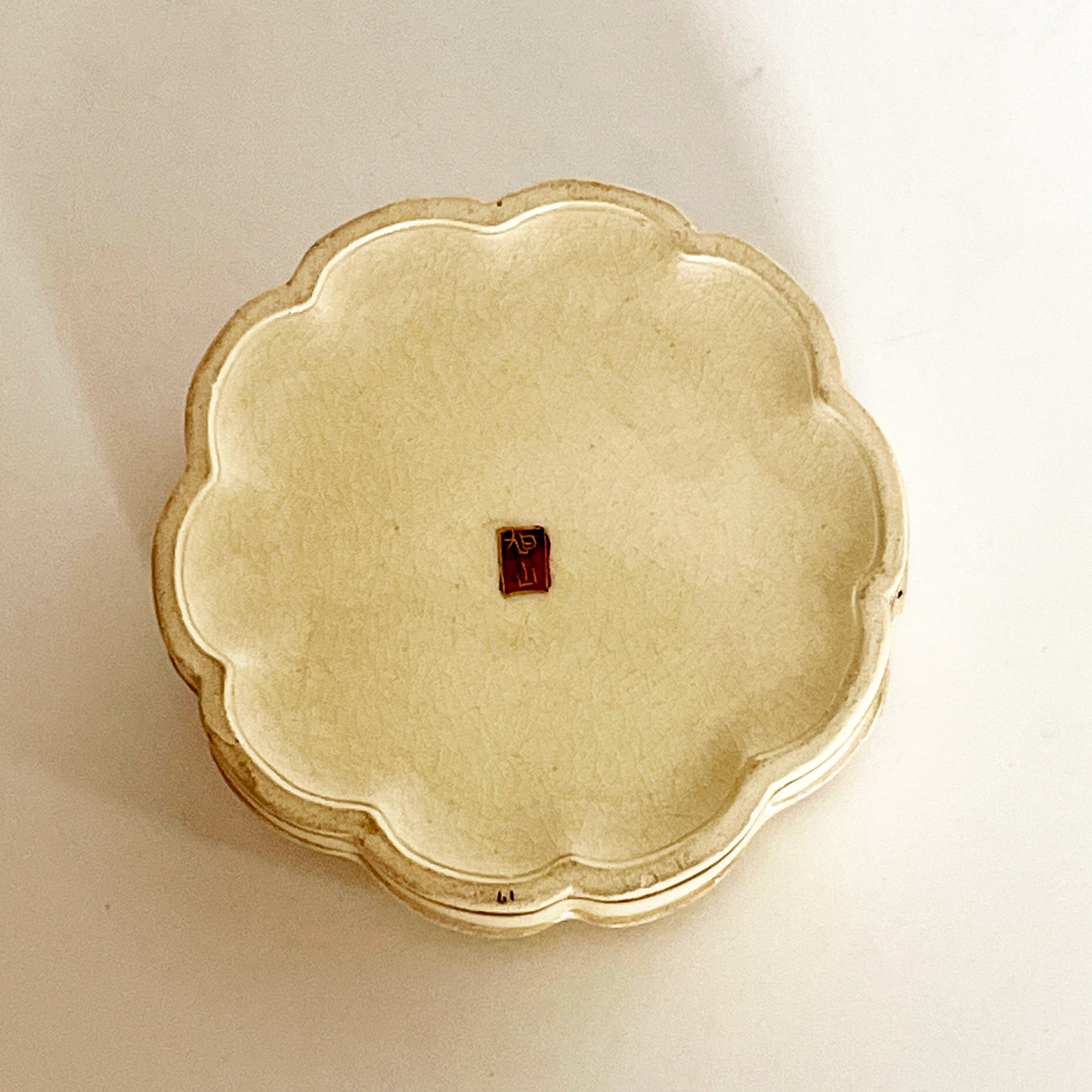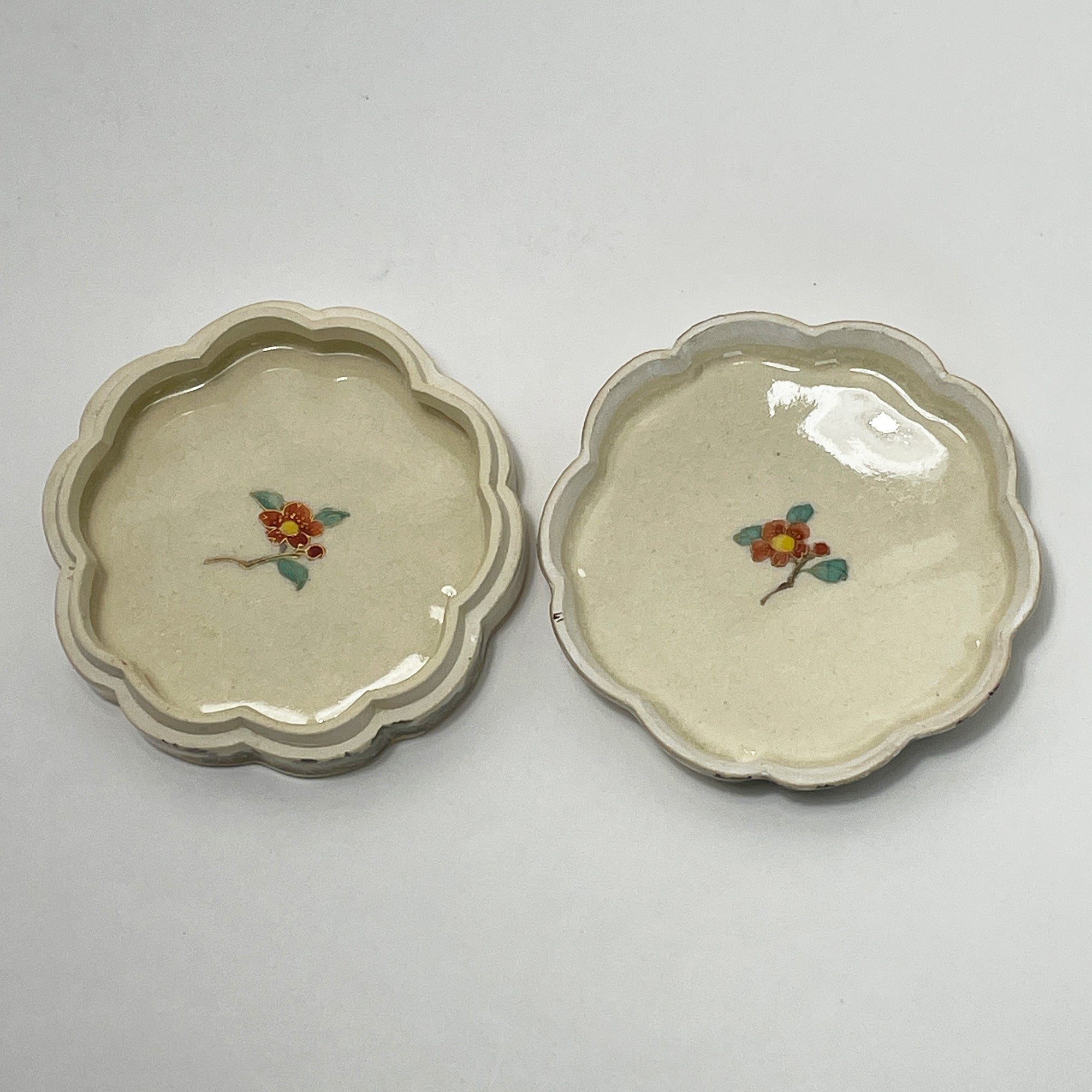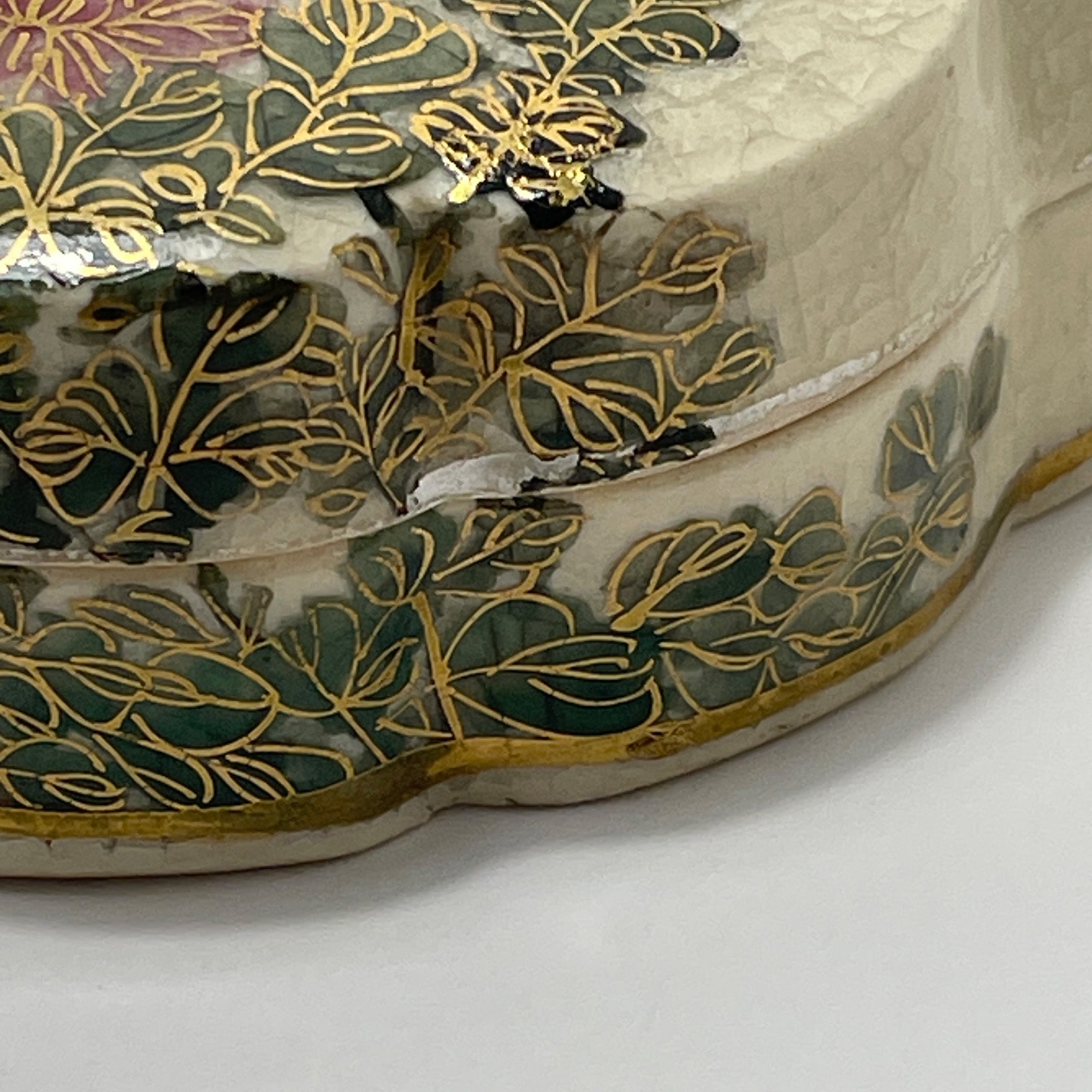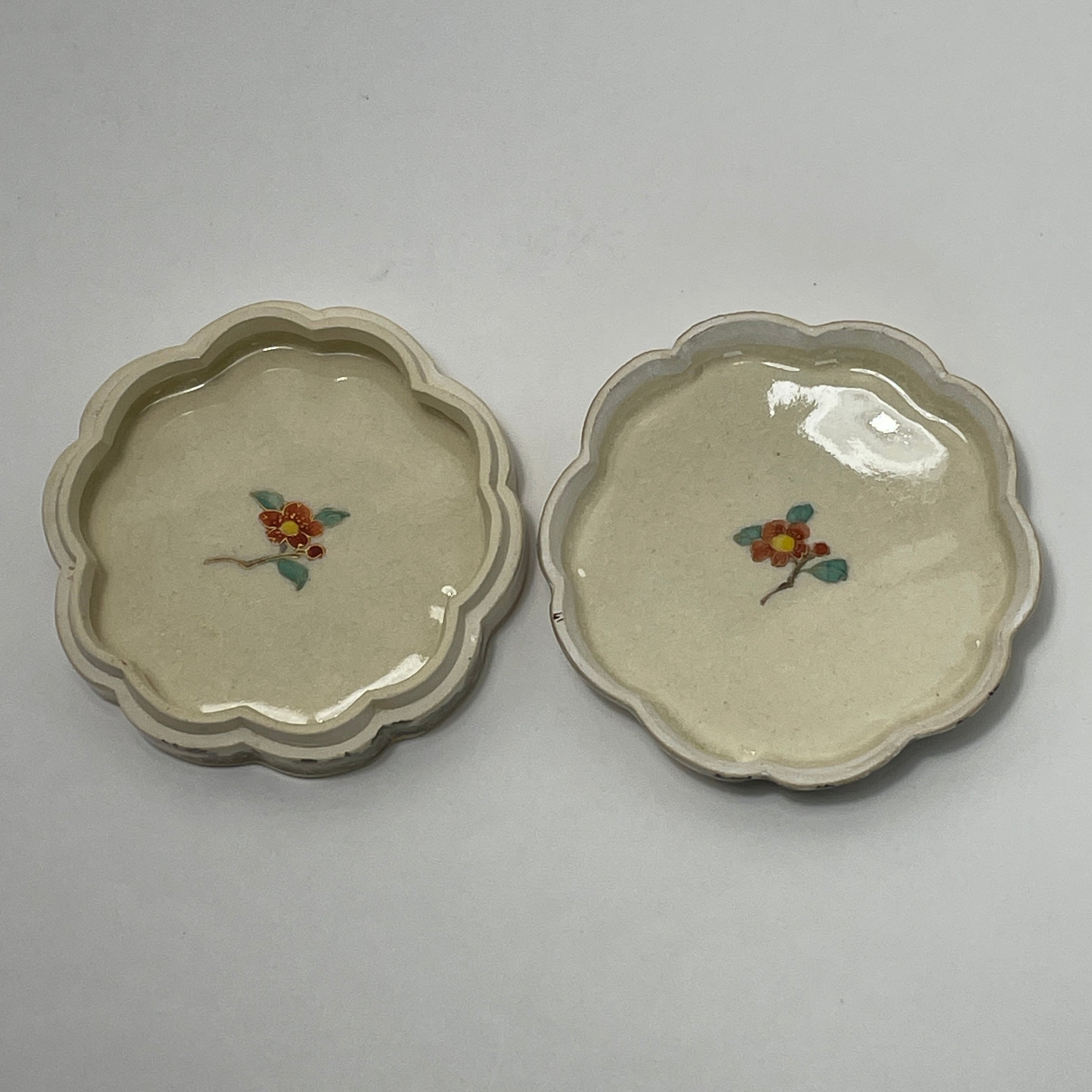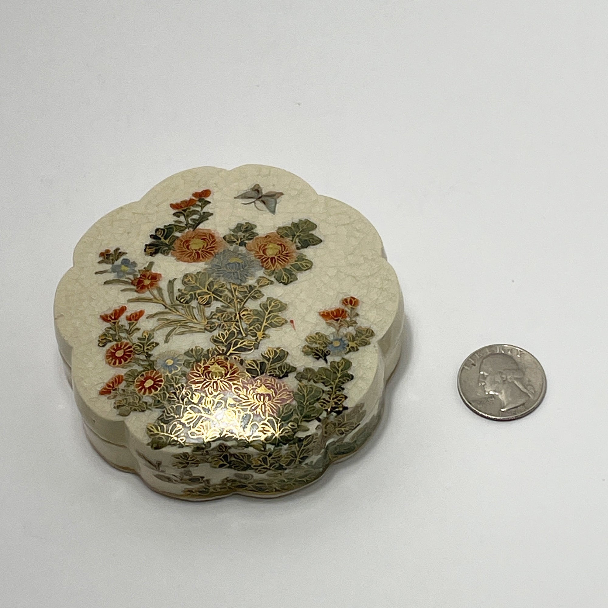 This vintage Satsuma Kyokuzan porcelain trinket box was created in Japan in the 1920’s. It is a small scalloped box decorated with a flower and butterfly motif. The inside cover and the base of the interior are also detailed with a flower motif. The bottom is marked Kyokuzan.