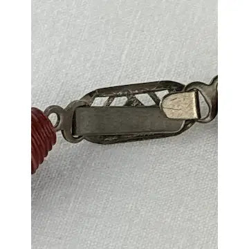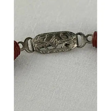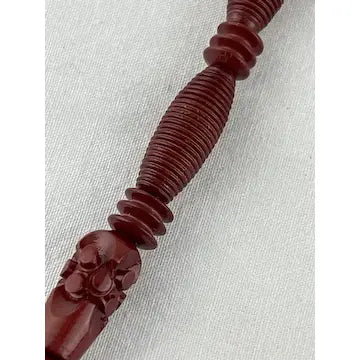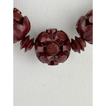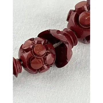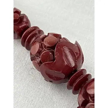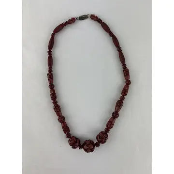 This vintage Chinese necklace boasts a stunning hand-carved red lacquer shou bead design. Made from cinnabar, the ascending and descending sizes add an elegant touch. Enhance your outfit with this unique and timeless piece.