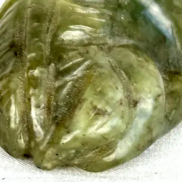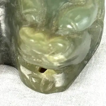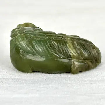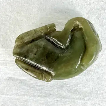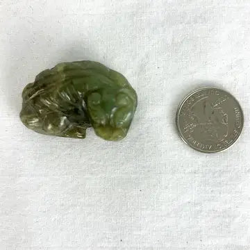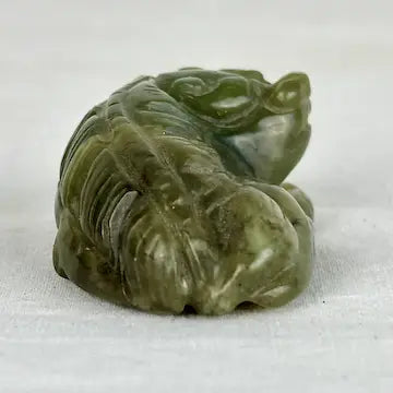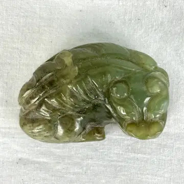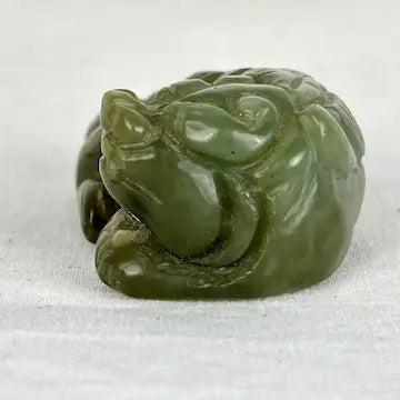 This collectible toggle is a hand-carved vintage piece made from authentic Chinese jade. The reclining foo dog design symbolizes protection and good fortune. The green hue of the jade is believed to promote balance and harmony. Historically, the toggle was used to hang it on a belt or pouch but could be used as a pendant now.