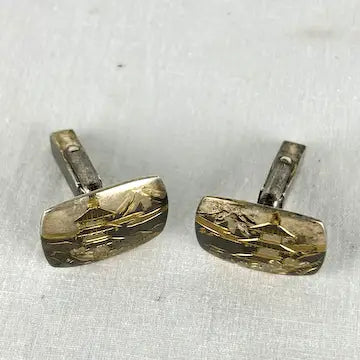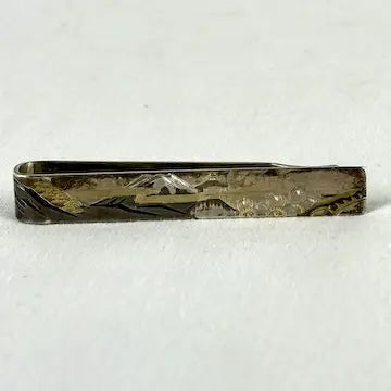 Vintage Japanese Oxidized Silver Cufflinks and Tie Clip with Etched Landscape Scene